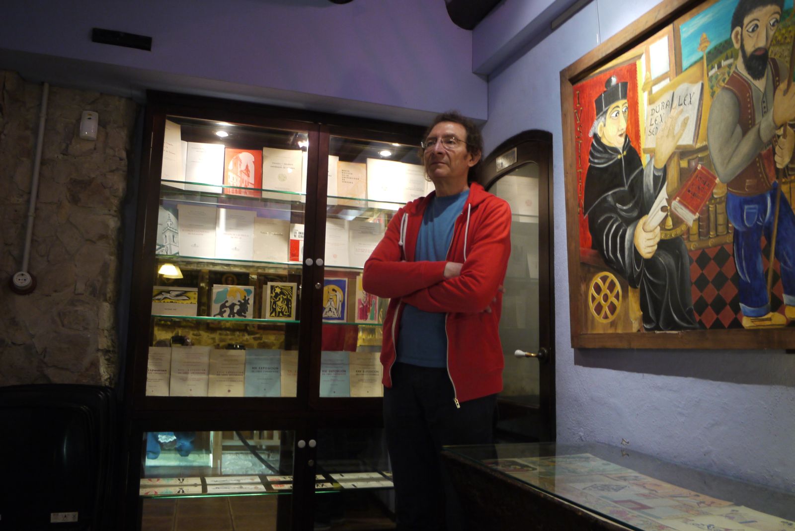 Aquí el podem veure, dempeus, entre la vitrina i la pastera on hi ha exposades obres de Josep Mª i Miquel.