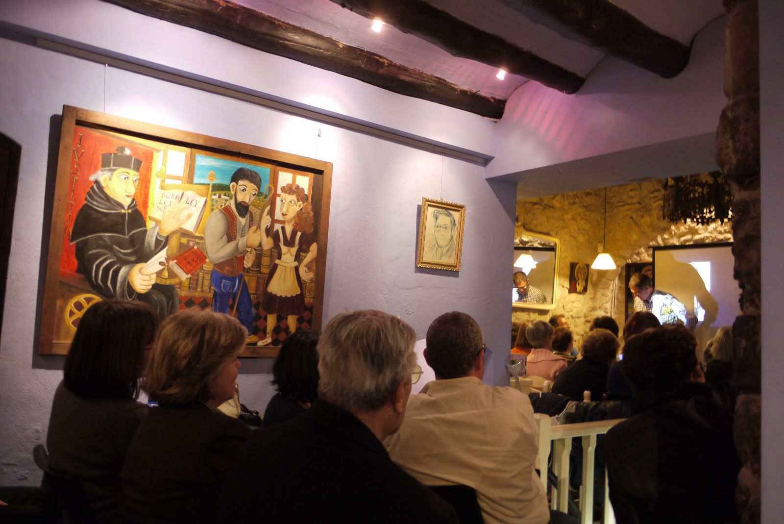 El públic, espera, acompanyat amb les especials pintures de Josep Mª Razquin que estan exposades a les sales Tibau, Nova i Seny Major, el començament de la conferència.