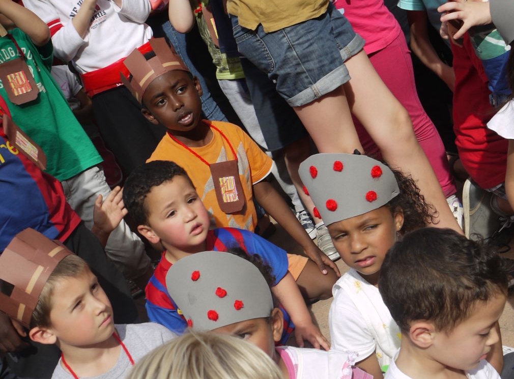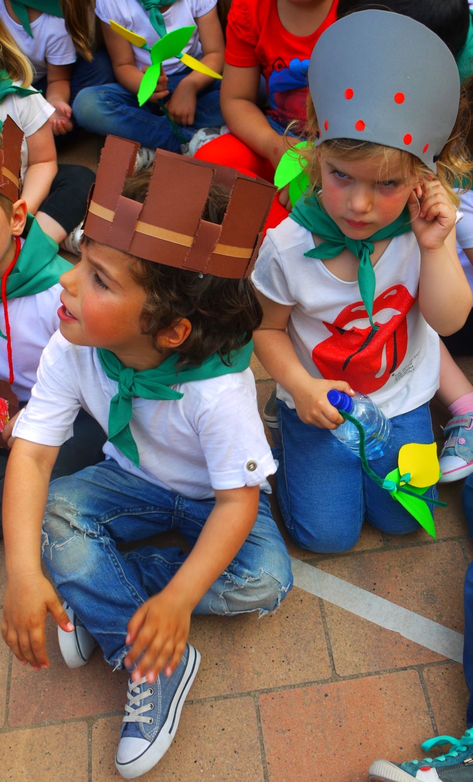 Els més petitons van fer un treball manual que lluïen amb orgull. Les nenes portaven una corona semblant a la de l’Almodis i un ram de flors, tot i imitant els trets característics de la nostra geganta. Els nens havien fer l’escut que porta Guillem i el duien, com ell, penjat al coll i al cap hi portaven una corona, semblant a la que llueix el nostre gegant.