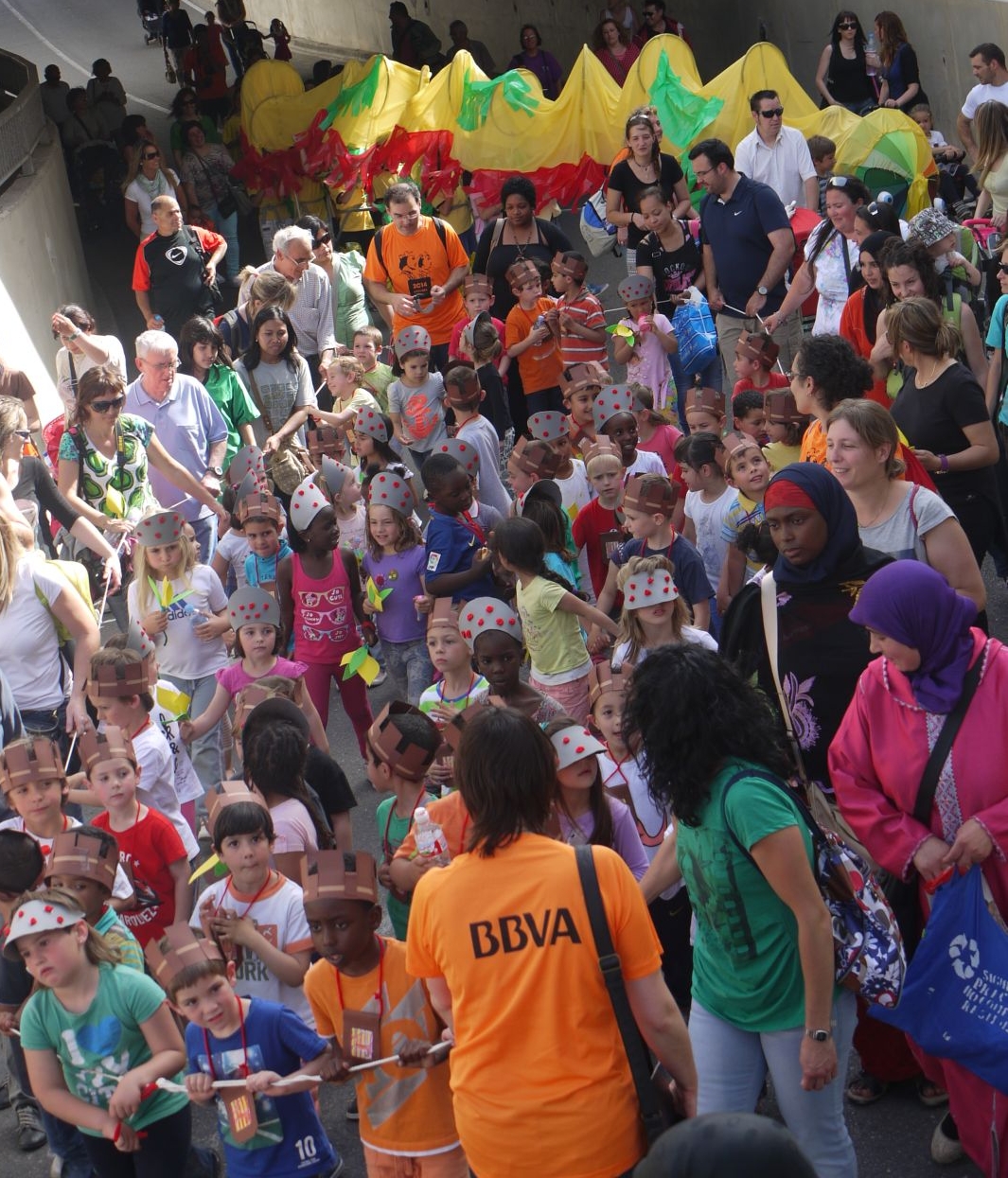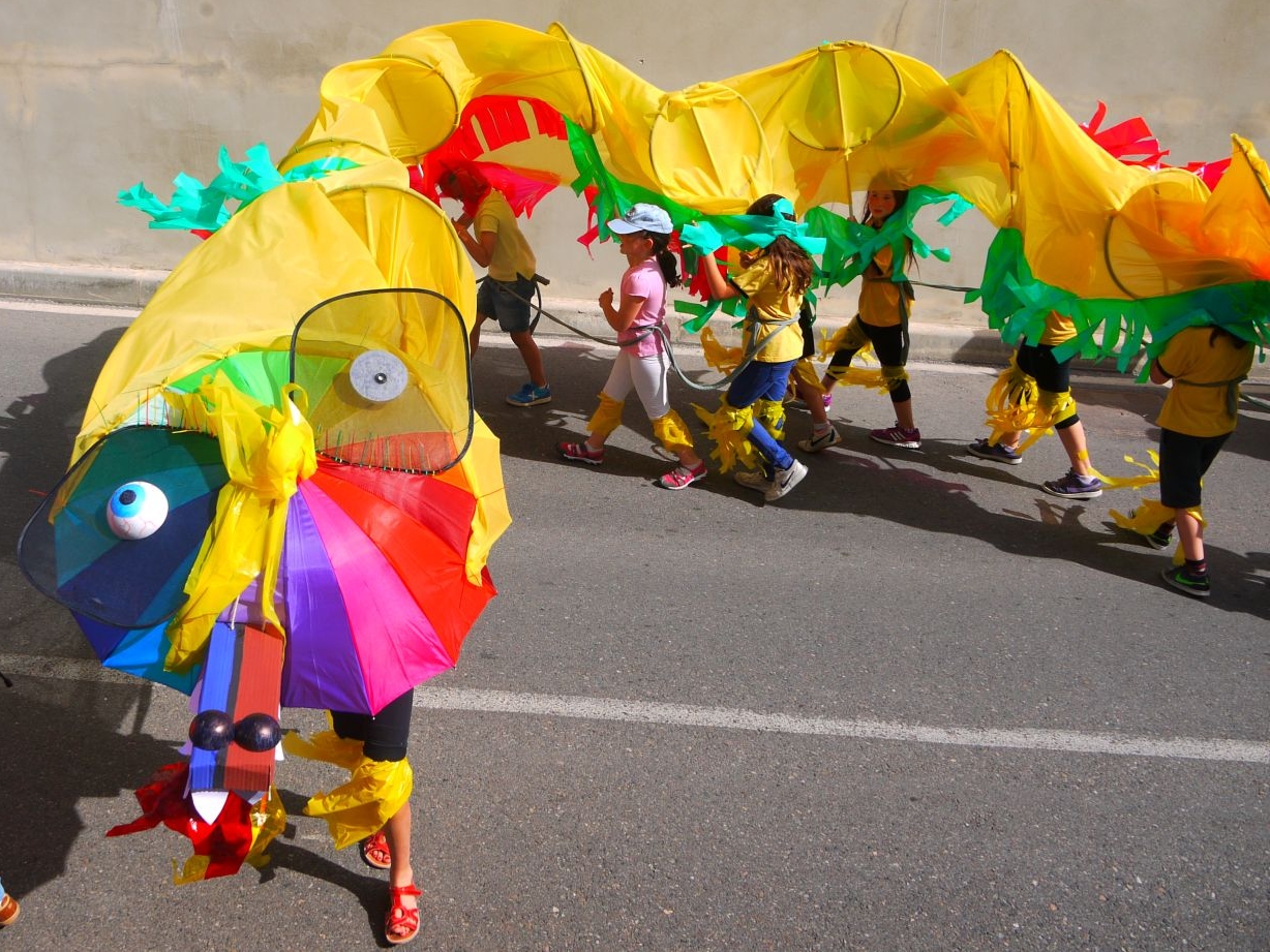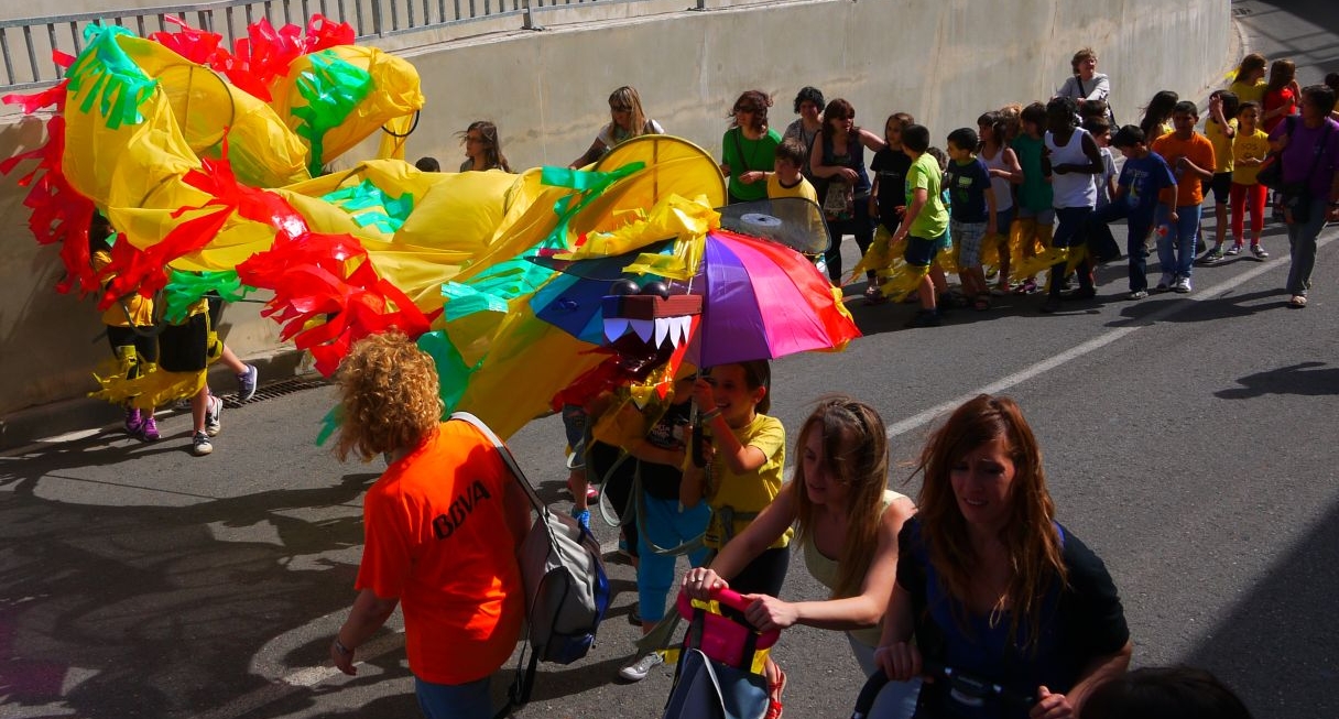Als centres escolars se’ls hi va donar el material que havien d’emprar per lluir en la cercavila. Un paraigua de colors era el cap d’un drac xinès que els infants arrossegaven enmig de l’alegria general. Aquest era el treball que corresponia als alumnes de cicle mitjà dels tres centres.