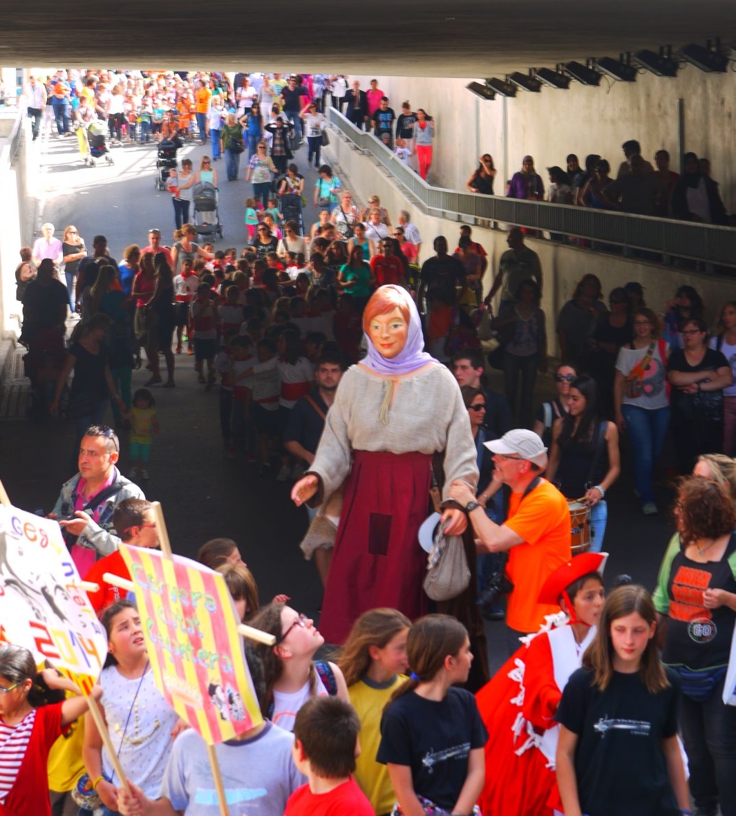 La cercavila amb els alumnes del CEIP Jaume Balmes avança per sota el tunel presidida per la gegantona Magdalena de Montclar. És la dels nens i nenes de Cervera. L’altre gegantó també venia al punt de trobada presidint una altra cercavila. Al davant de cadascuna d’elles, un grup de tabals i gralles fan l’acompanyament musical tocant el ball de la polca que els nens i nenes ballen al llarg del recorregut.