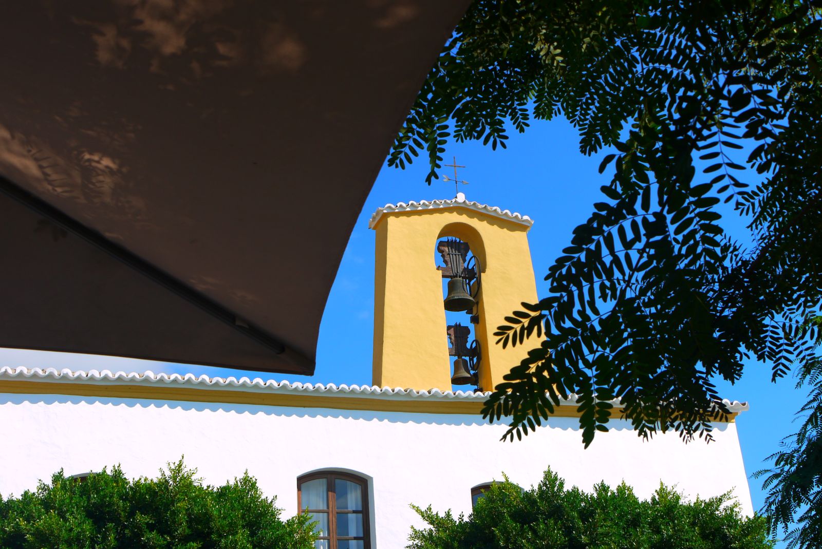 … vigilada per aquest campanar pintat en ocre, que és l’altre color que s’afegeix al blanc, tot i contrastant-hi, és un lloc de trobada i de repós amb un encant especial i amb unes botigues que enamoren