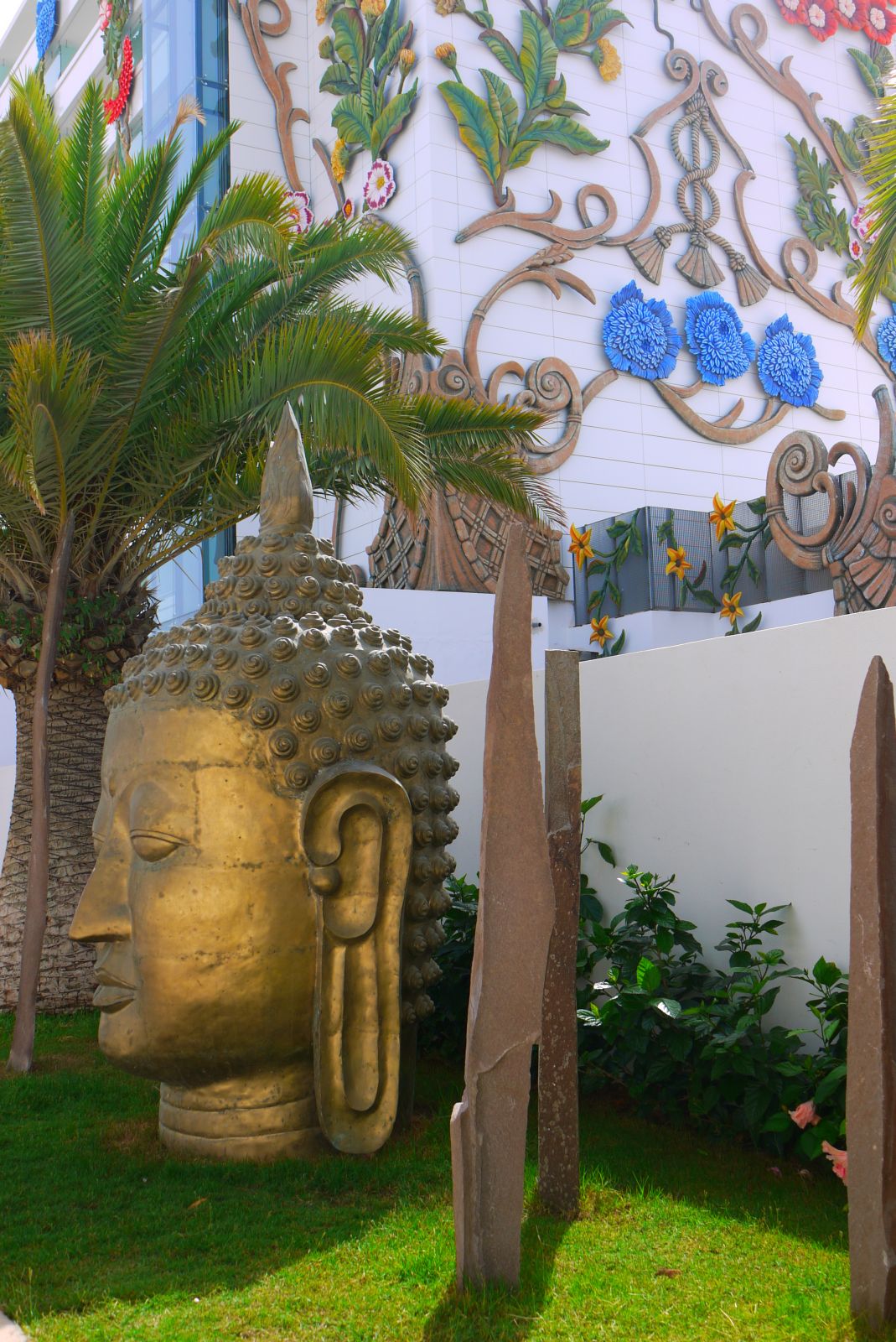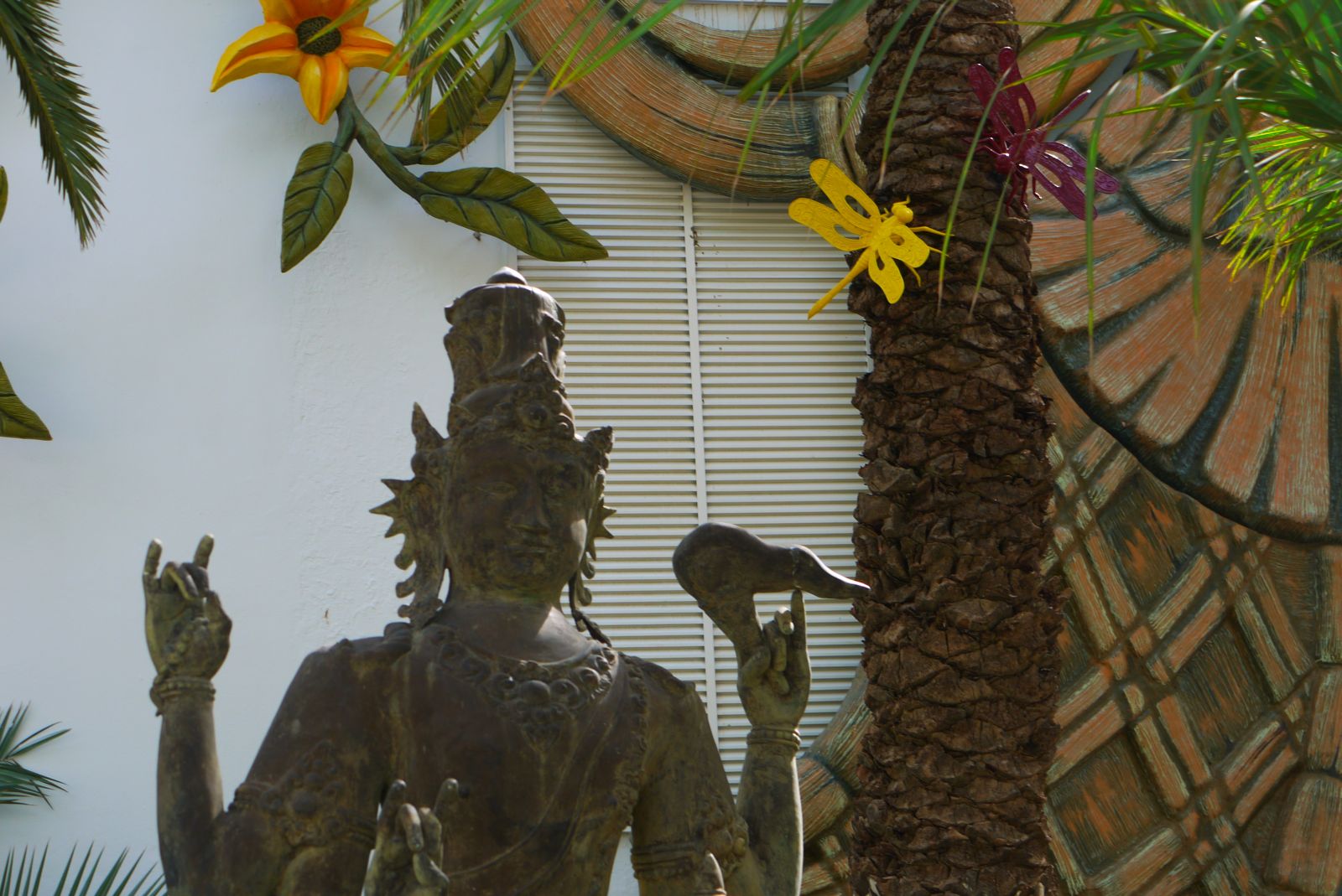 Val a dir que l’edifici, en veure’l per primera vegada, ofereix un impacte visual important. I tot i que hi ha una barreja de motius decoratius, la sorpresa és favorable. A l’entrada el record d’indrets exòtics hi és present amb aquestes escultures de simbologia oriental…
