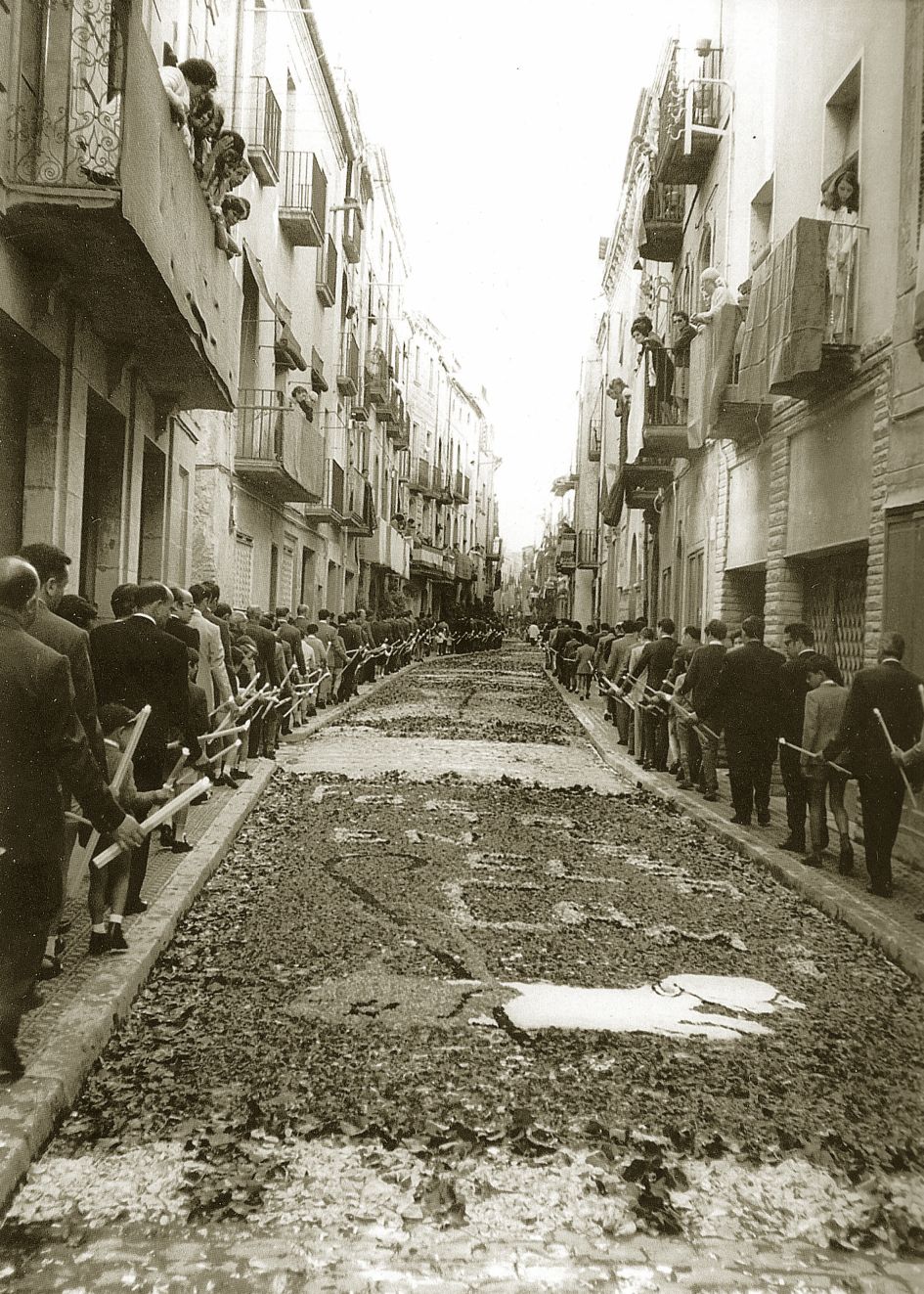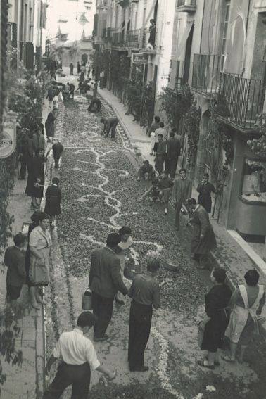 Catifes de flors al carrer Major. Tenir una cereria, en aquell temps, era un bon negoci. Només cal veure les torxes que porten tots els homes. Les dones no anaven a la processó. Com podeu veure, omplien els balcons al seu pas.