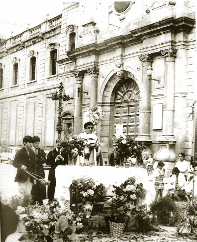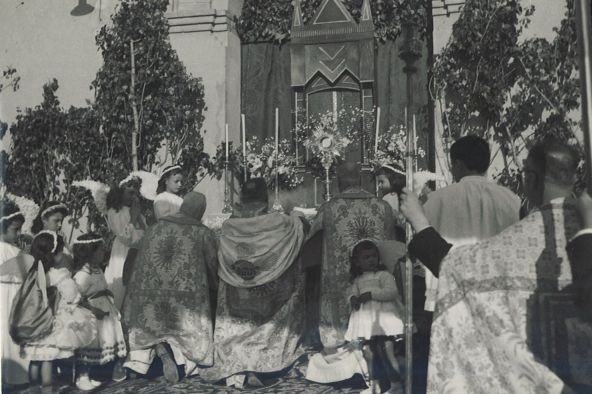 Mossén Ignasi Montraveta fent una parada en un altar en una processó de Corpus dels anys seixanta, inicis dels setanta.