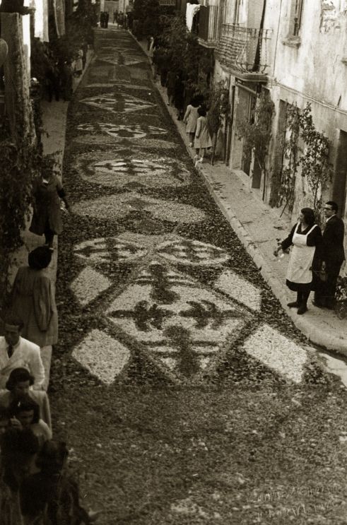 Una catifa molt ben dibuixada i elaborada. Sembla que estigui feta amb serradures. En primer pla, la Sra. Roseta de cal Morell mira complaguda el resultat d’aquesta obra, des del balcó del seu habitatge al carrer Combat.