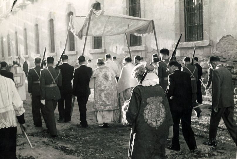 La custòdia aixoplugada sota el talem eren dos dels elements més representatius de la processó. A mà dreta, el megte cerverí Tomás Peropadre.