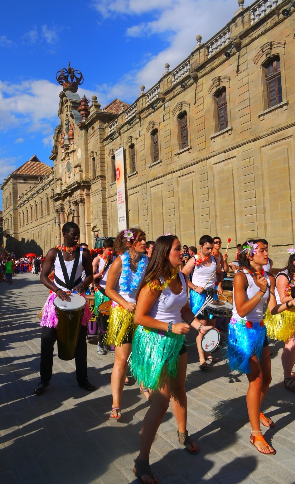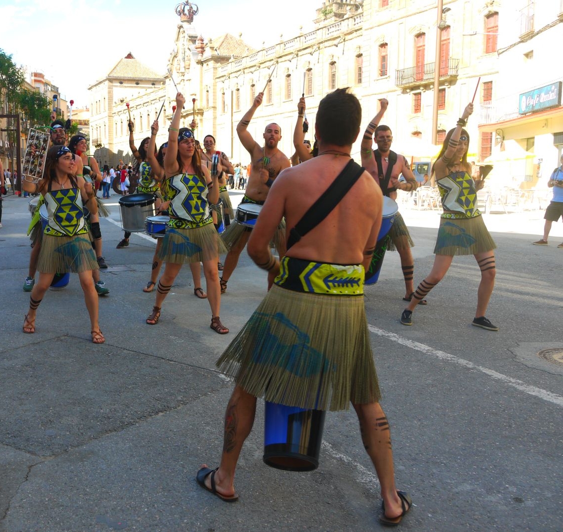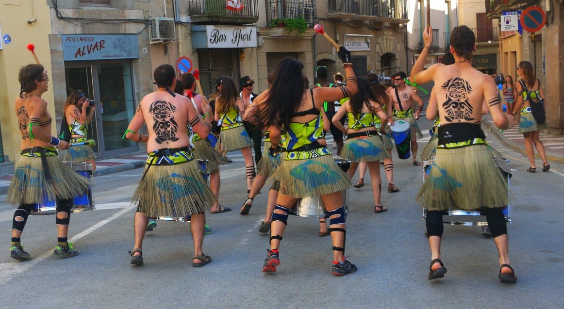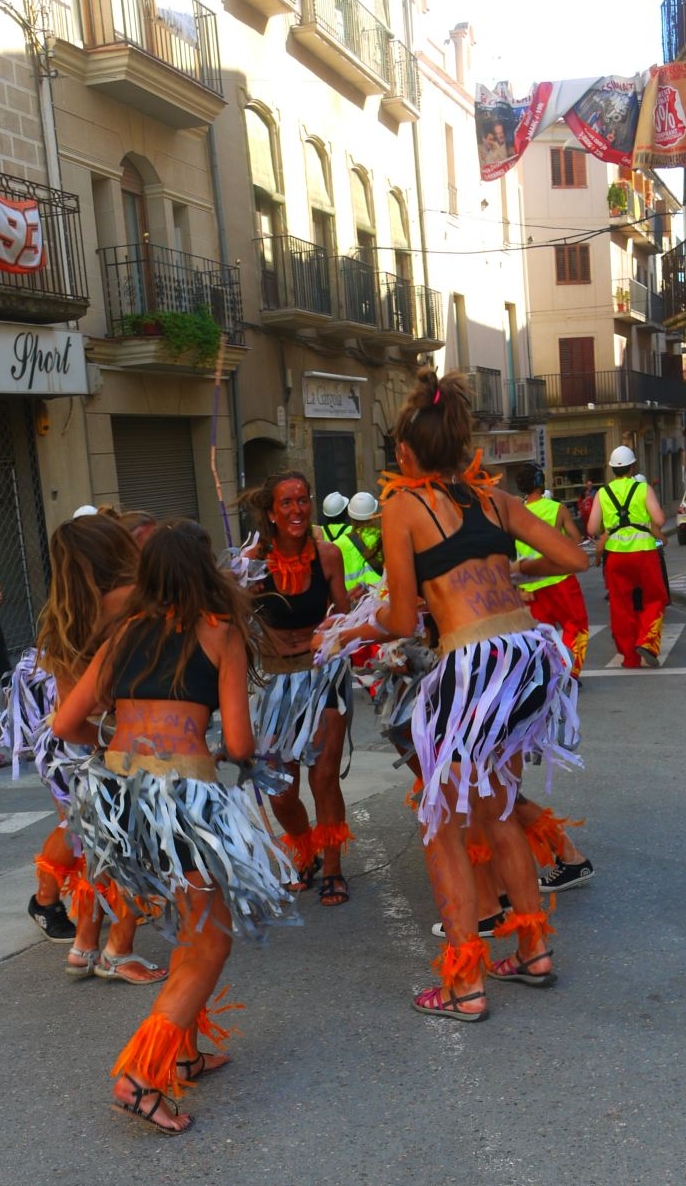 Un altre grup de percusió que desfila amb alegria i poca roba. Una disfressa molt bonica que ens porta el record de tribus exòtiques i de països llunyans…
