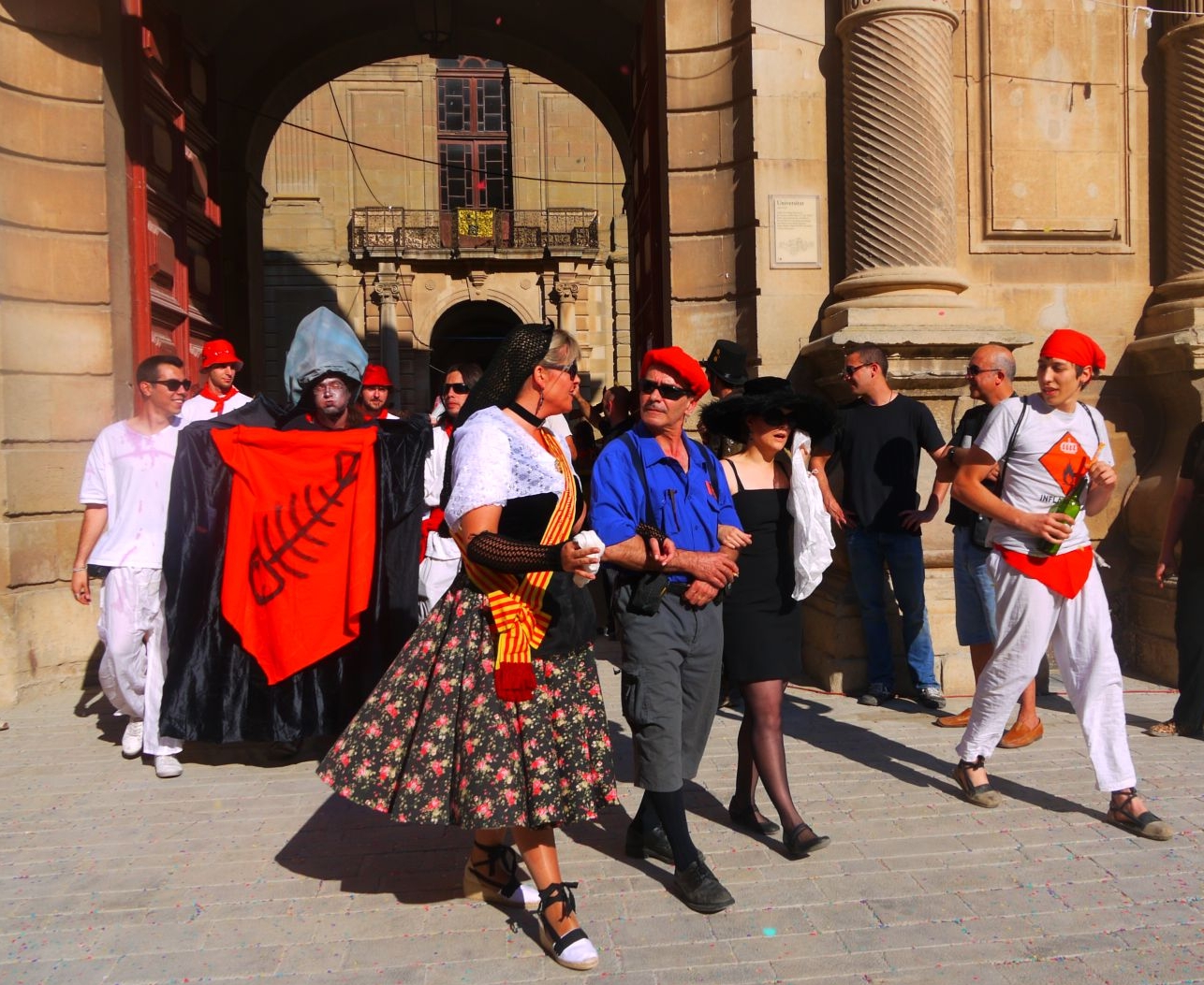 Al seu darrera, la sardina surt acompanyada d’un grup de joves que ens recorden els protagonistes del Dijous Gras de l’Aquelarre: les mateixes cares i també vestits de blanc.