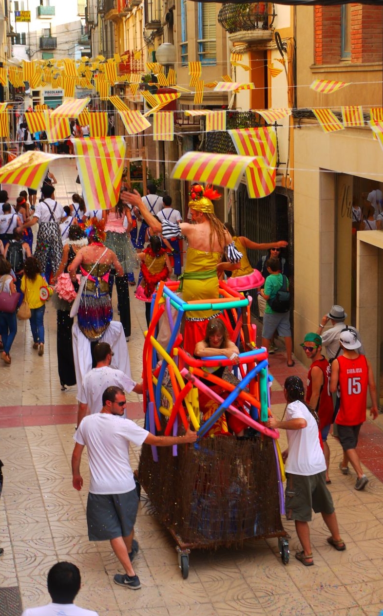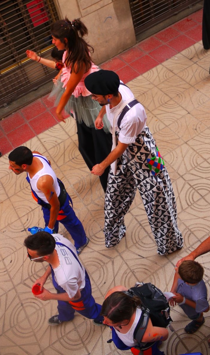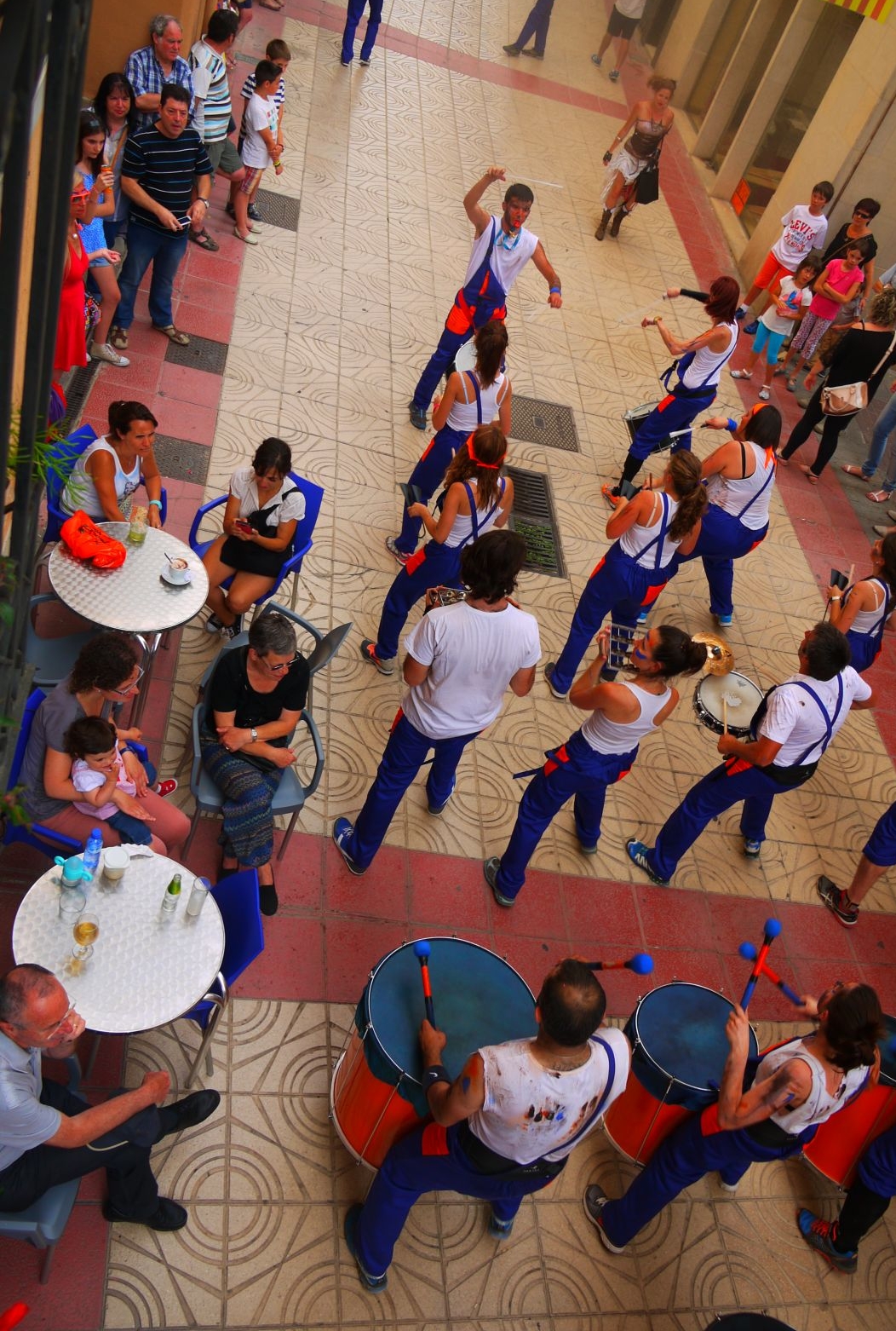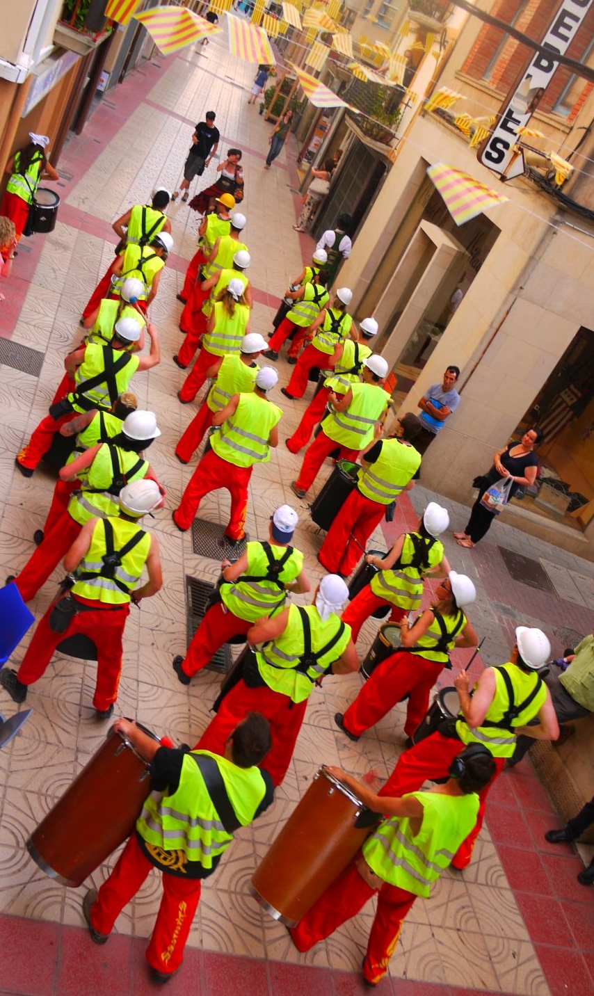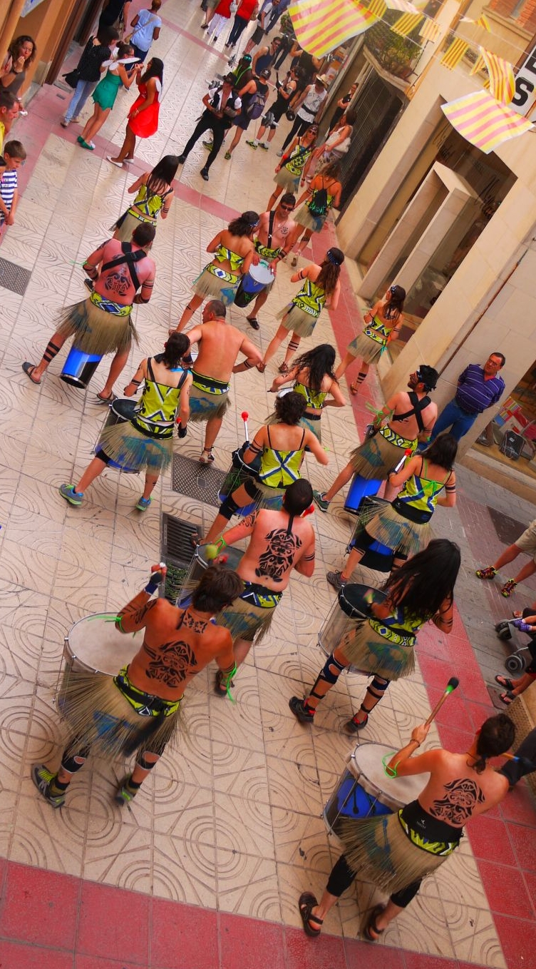 Des d’un balcó sempre es té una perspectiva diferent del que passa al carrer. El primer grup de percusió va desfilant il·luminant el carrer amb aquesta combinació de verd i vermell ataronjat que enlluerna!