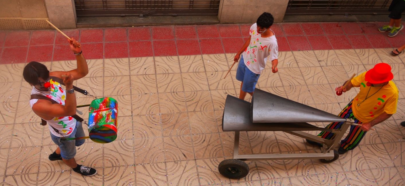Arriben els Bombollers. La visió de dalt cap a baix va donar unes imatges, en les que s’apreciava amb detall, tot l’embalum de pots i bidons, customitzats i reciclats com a instruments musicals. Fixeu-vos-hi bé!