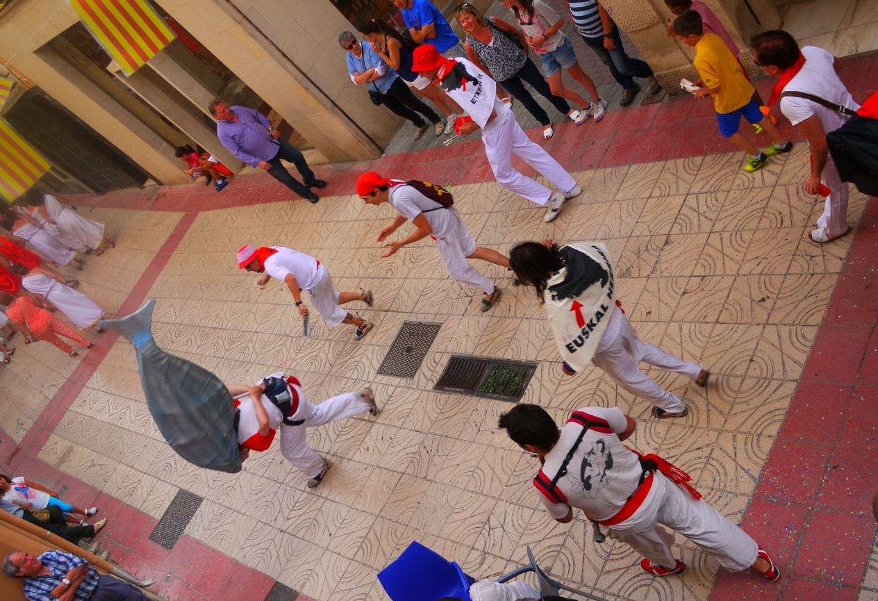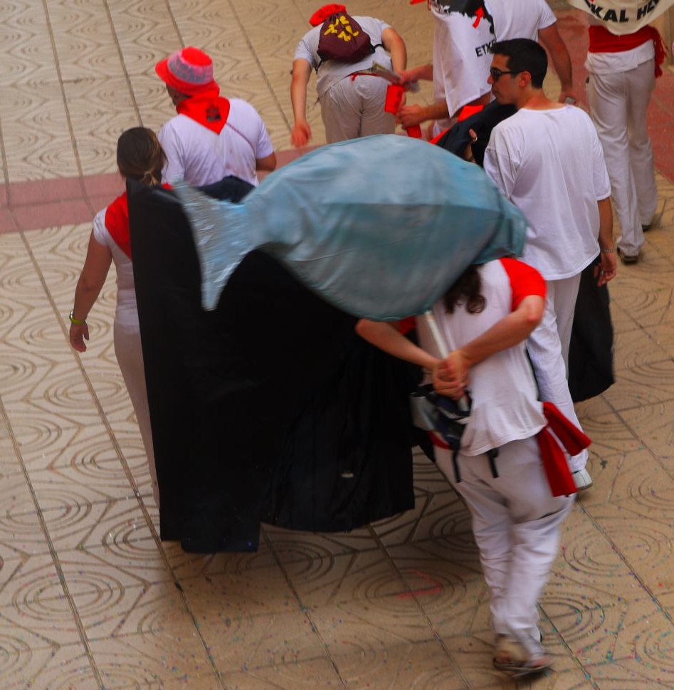 La Sardina anava ben esbojarrada. Tan seriosa que sortia de la Universitat i després, no va parar de fer bestieses! El personal que l’acompanyava es devien sentir mimetitzats amb l’allau de participants als Sant Fermins. O sigui que anaven vestits com si Cervera fos Pamplona!