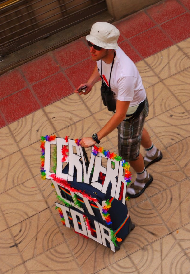 Va ser remarcable, tot i que era el primer cop que s’organitzava, que bastants grups s’animessin i decidissin disfressar-se i afegir-se a l’espectacle. Aquest jove anunciava un tour per Cervera i anava acompanayat d’un grupet que no paraven d’anar d’aquí cap allà, informant i animant a la gent perquè s’apuntés a aquest tour…