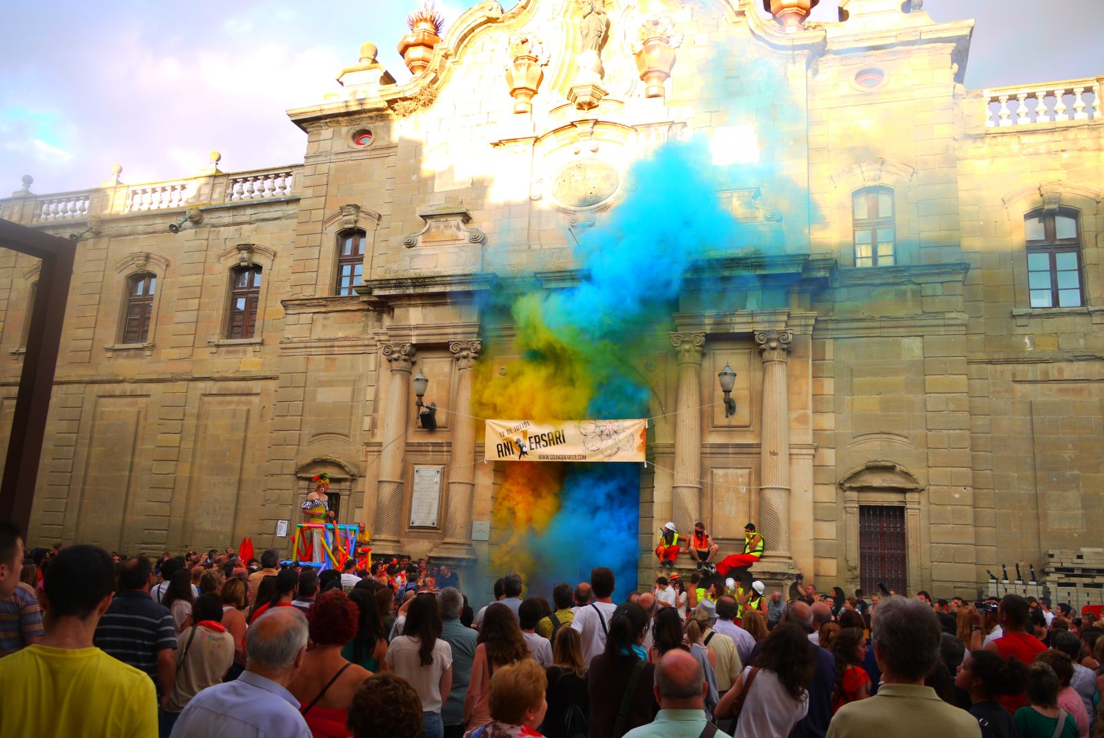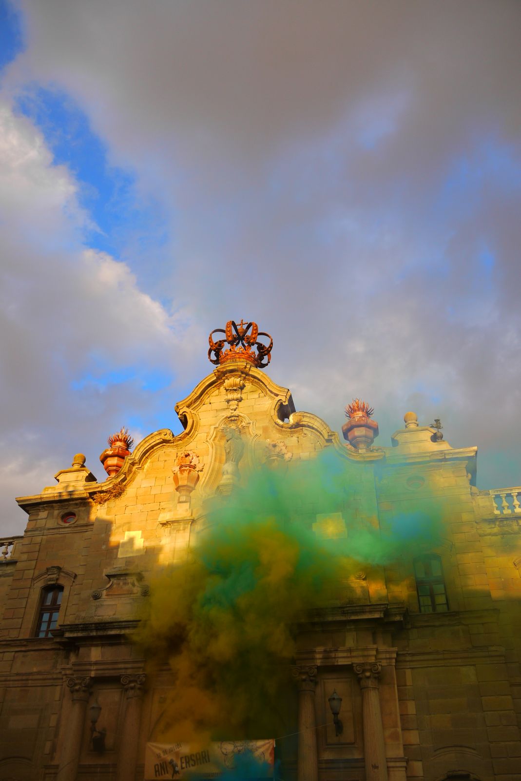 De sobte, esperant la propera actuació, començà a sortir fum de colors davant la façana de la Universitat.