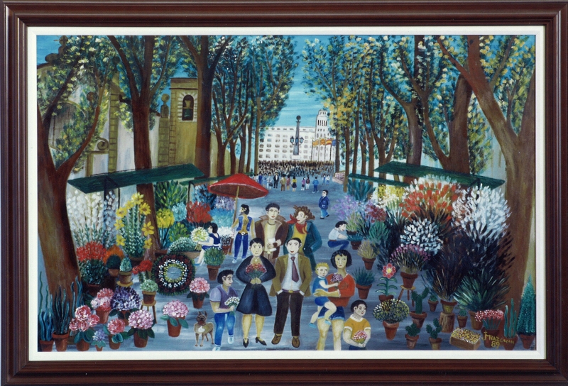 Josep Mª Razquin treballà molts anys a Barcelona i, les Rambles, properes al seu lloc de treball, li van inspirar aquesta bonica composició.