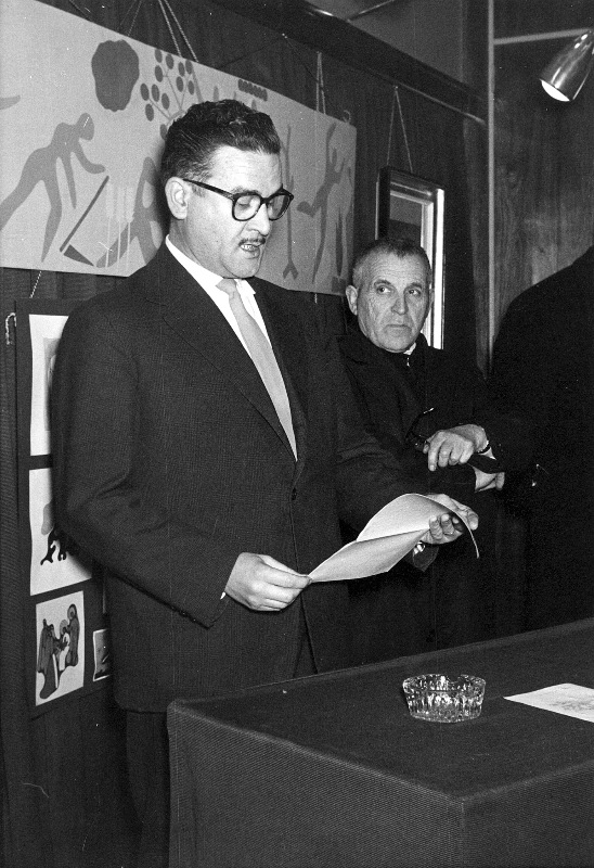 La sala d’Exposicions de la Caixa de Pensions va ser tot un referent en una època tan llunyana. El Sr. Faustino Millán, Director de la institució a Cervera i el Rector de la ciutat Mn. Ramon Rota Canal en l’acte de la inauguració d’una exposició dedicada a l’obra Miquel Razquin.