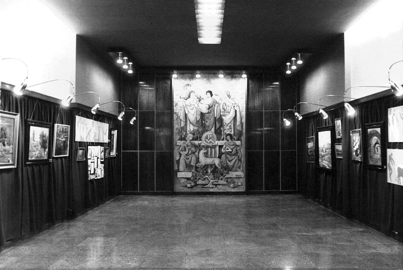 Vista general d’aquesta sala, que feia molt goig. Recordo que, especialment per la Festa Major del Sant Crist, s’hi feien exposicions molt reexides. Jo hi havia treballat vigilant-les i atenent als visitants. El mural del fons va ser realitzat per la pintora cerverina, resident a Barcelona, Rosita Anglarill Mateu.