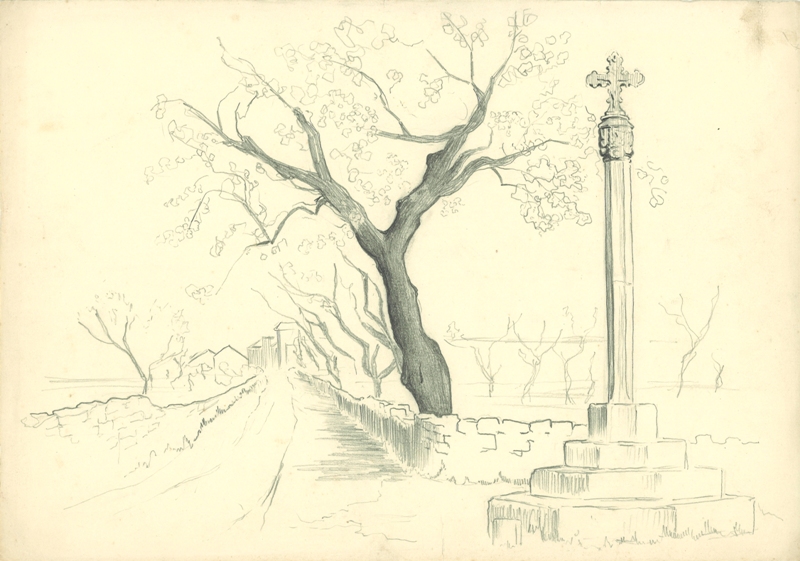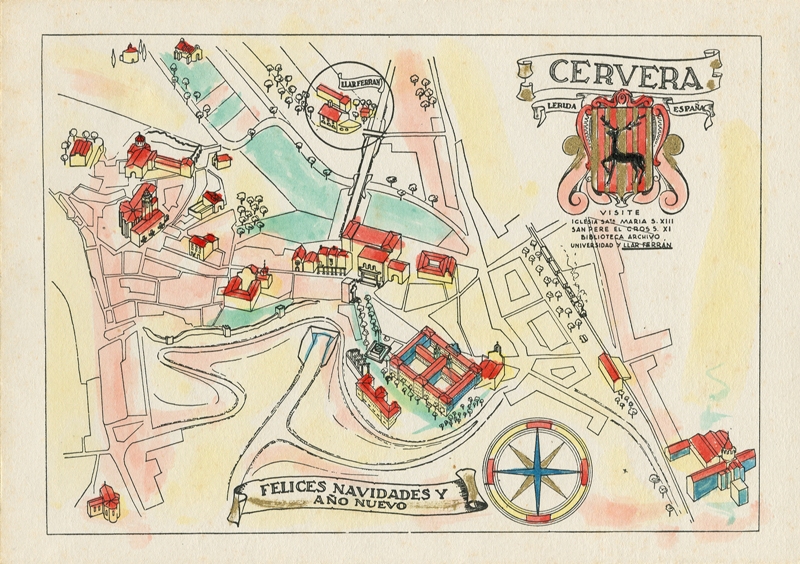 Miquel Razquin en aquest dibuix ens transmet la vocació que tenia per la vessant més lineal del dibuix i que l’hauria portat a un treball dins de l’arquitectura. Aquest plànol de Cervera destaca els edificis més rellevants i sembla que va ser utilitzat per felicitar el Nadal.