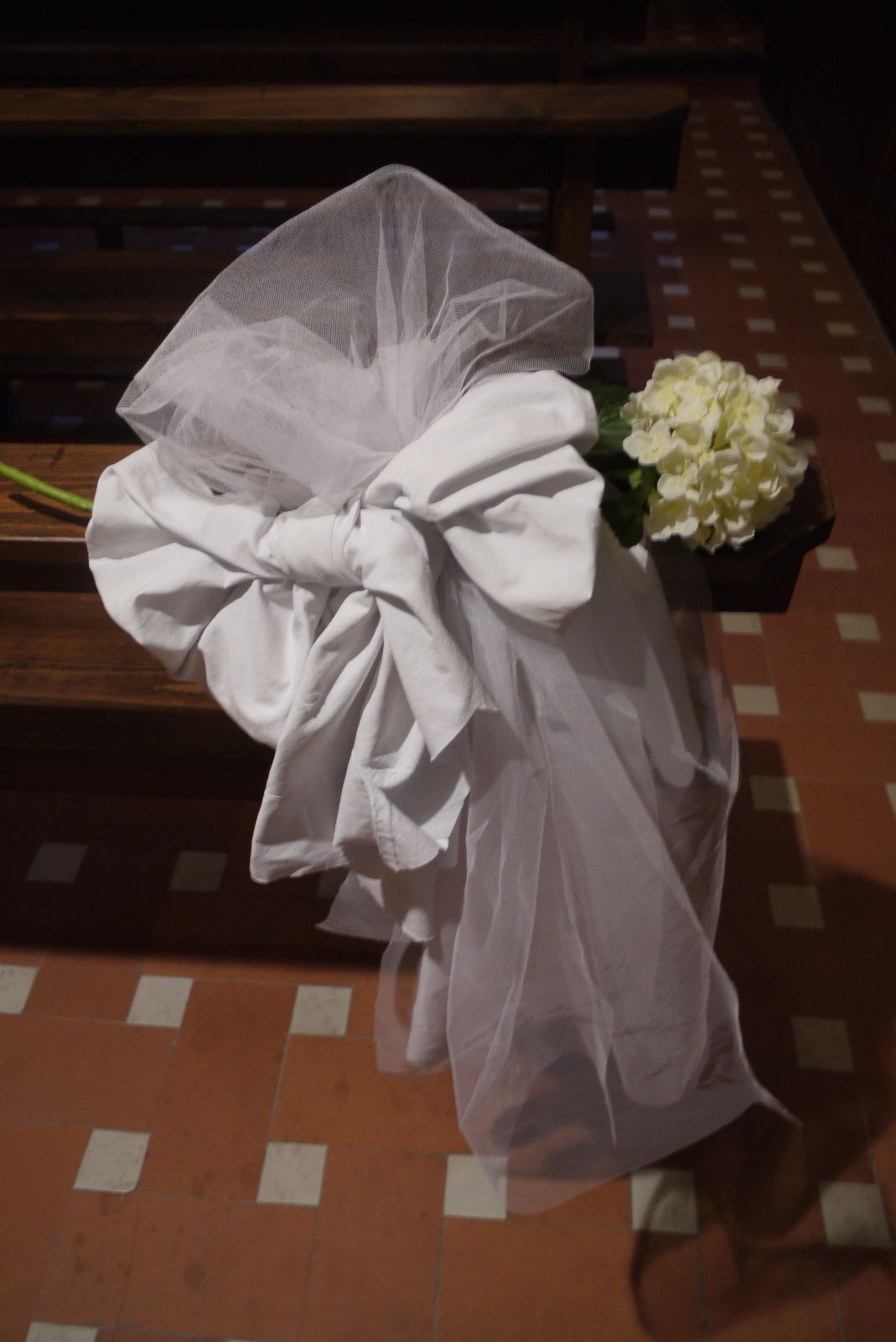 Detall d’un element decoratiu posat a un banc de l’església i realitzat amb tul i roba de cotó procedent de llençols antics.