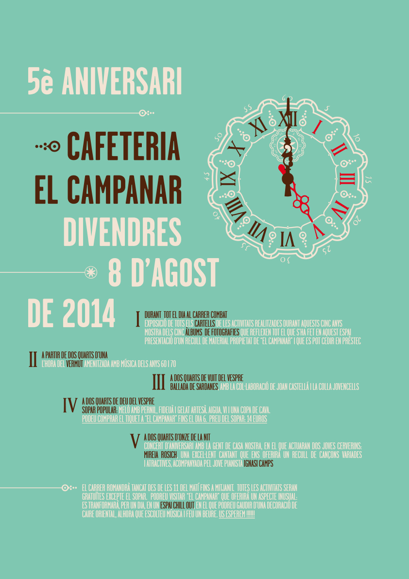 El cartell el va dissenyar Xavi Miret i és molt encertat. Aquest color tan especial del fons és el to turquesa que envolta el rellotge de el Campanar de la ciutat i que aquí, representa que s’escampa per tot el voltant. La part interior del rellotge té marcats els números en vermell fins el cinc, on està parada la busca de les hores, també en vermell, recordant aquest cinquè aniversari. Les activitats organitzades estan encapçalades per aquests números romans del rellotge. Com podeu veure és un disseny en el que cal fer-hi aquesta lectura amagada per valorar-lo. El resultat és perfecte, tant pel que fa a l’aspecte visual, com a la part de comunicació i transmissió del missatge que s’anuncia.