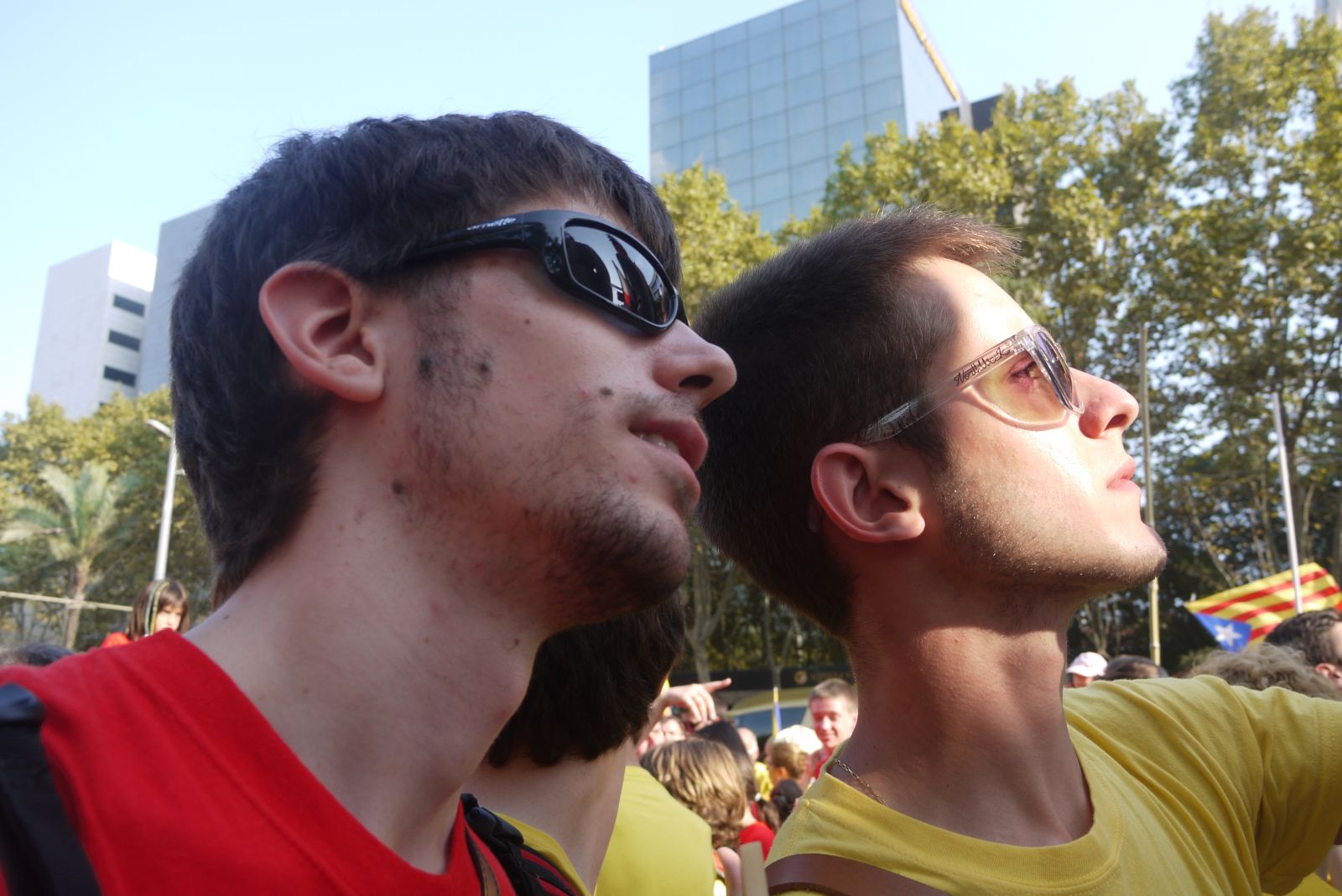 Dos joves que, com la majoria, es van posar les ulleres de sol per protegir-se, ja que la llum era intensa.