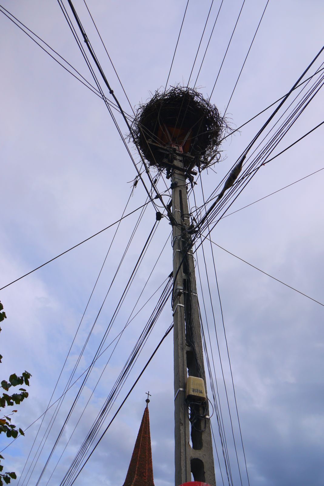 Les cigonyes sembla que han triat un lloc perillós per fer-hi el niu rebutjant la torre de l’església que hi ha a la vora.