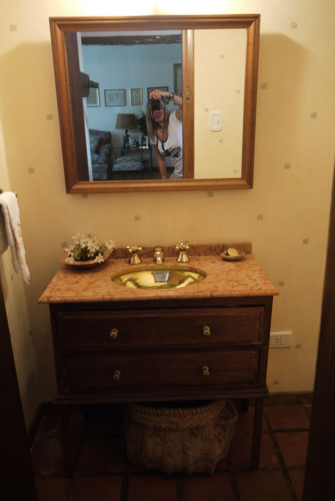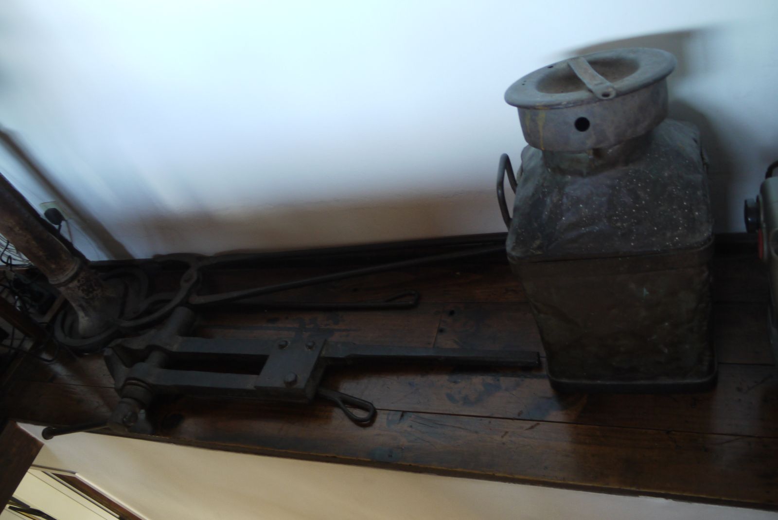 L’imprompta cerverina també s’ha colat enmig d’aquest ambient anglès. Aquest estri que podeu veure sota el lavabo és una sàrria portada de Cervera.  És un regal de Salvador Llobet Pla. Està feta amb espoltins i era per portar la polpa de les olives al molí al carregar la premsa. Normalment no està sota el moblet, sinó més cap a la dreta, i la fan servir per posar-hi revistes.