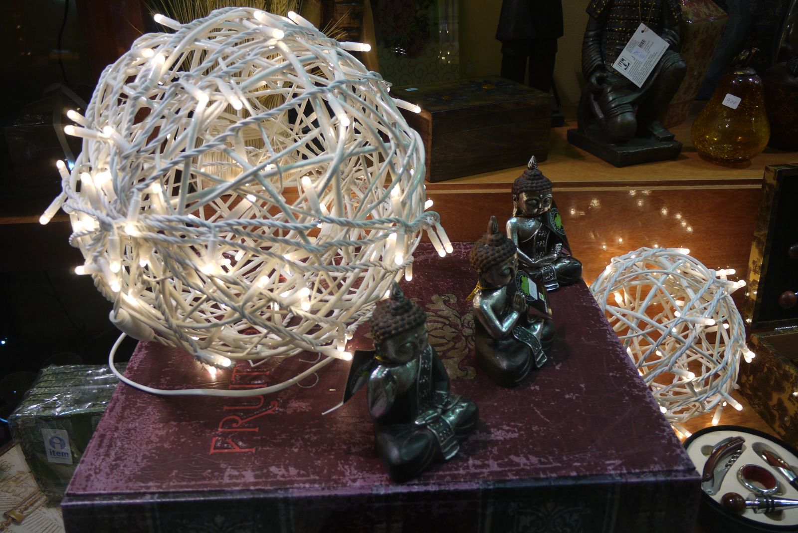 L’aparador de La Farigola és d’aquells que tot l’any t’hi atures, especialment si vas amb infants. Sempre el trobem ple d’objectes bonics i variats. Aquestes esferes lluminoses donen claror a aquest racó en el que dominen els tons foscos.