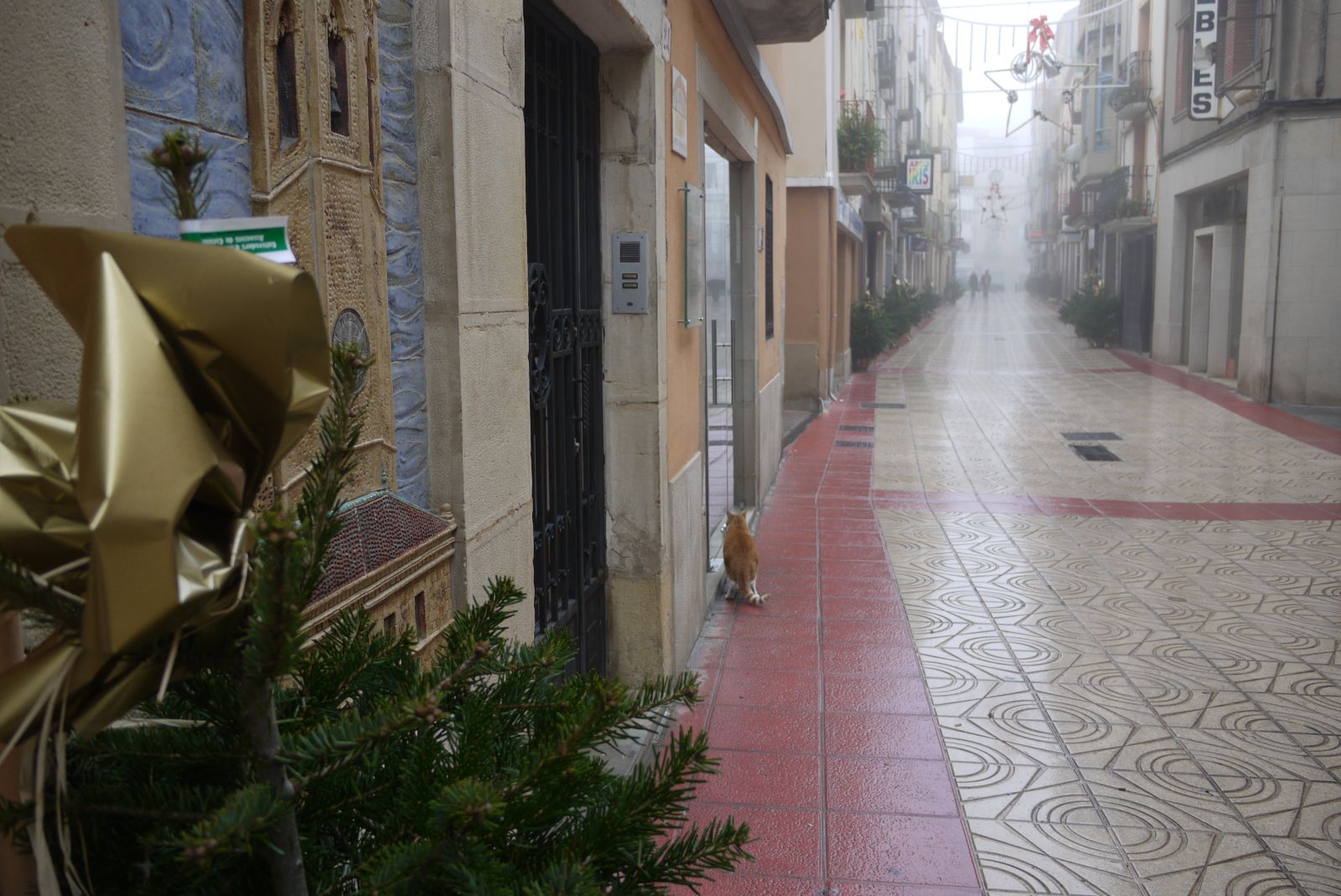 Tot i que el matí del dia de Nadal quasi tothom resta a casa, el gat de “el Campanar”, que no entén de calendaris ni de festes, espera que obrin per tal de trobar recer i menjar. Al fons, dues figures vaporoses i esvanides, donen un toc de vida, en aquest carrer solitari en un dia tan assenyalat.