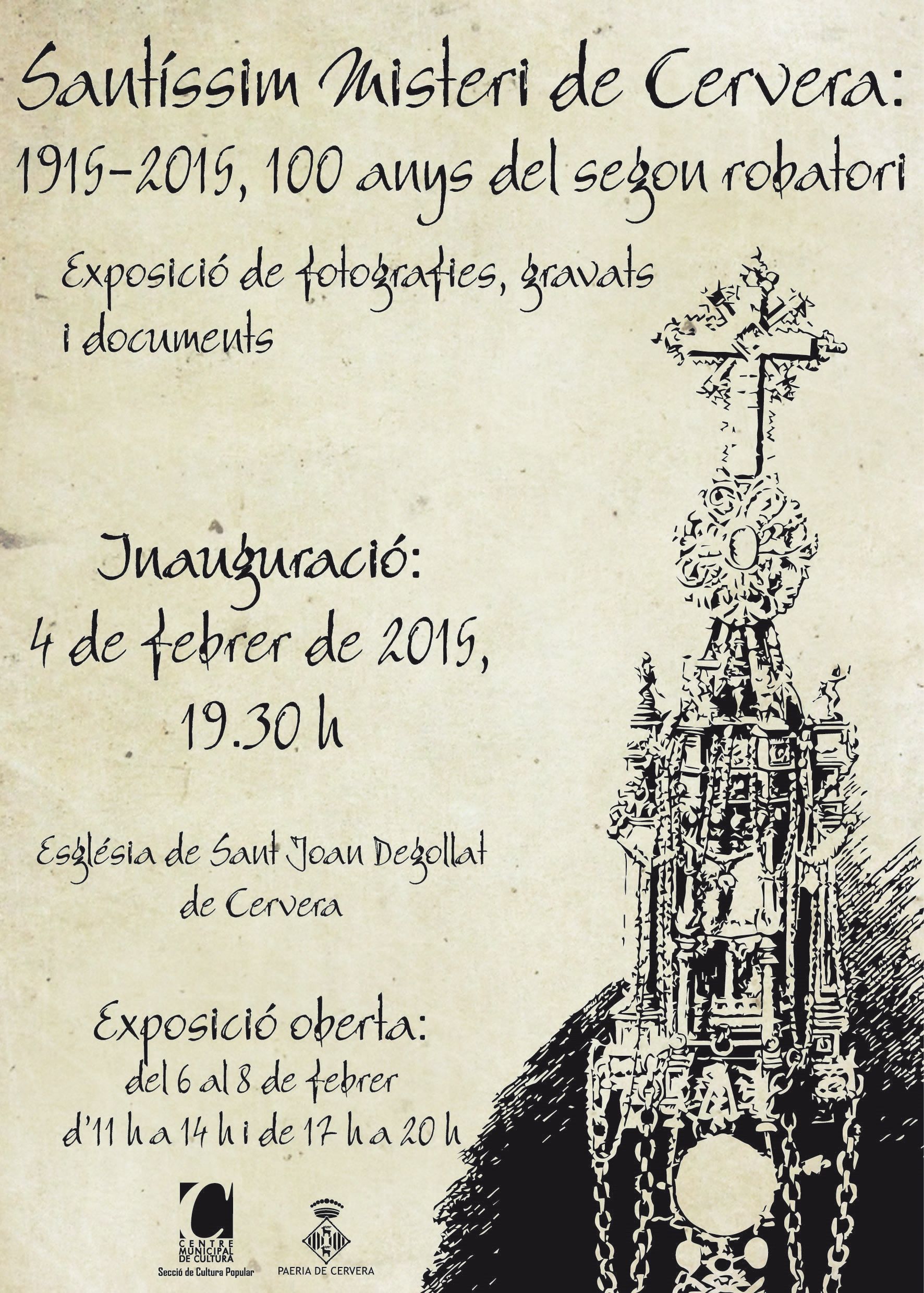 L’antiga església de Sant Joan de Jerusalem, coneguda també com Sant Joan Degollat ha estar l’espai on s’ha muntat una exposició de fotografies, gravats i documents que amb el nom de Santíssim Misteri de Cervera: 1915-2015, 100 anys del segon robatori fa un recorregut per la història d’aquests darrers cent anys vinculats amb diferents aspectes de tot el relacionat amb el Santíssim Misteri.
