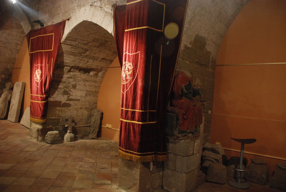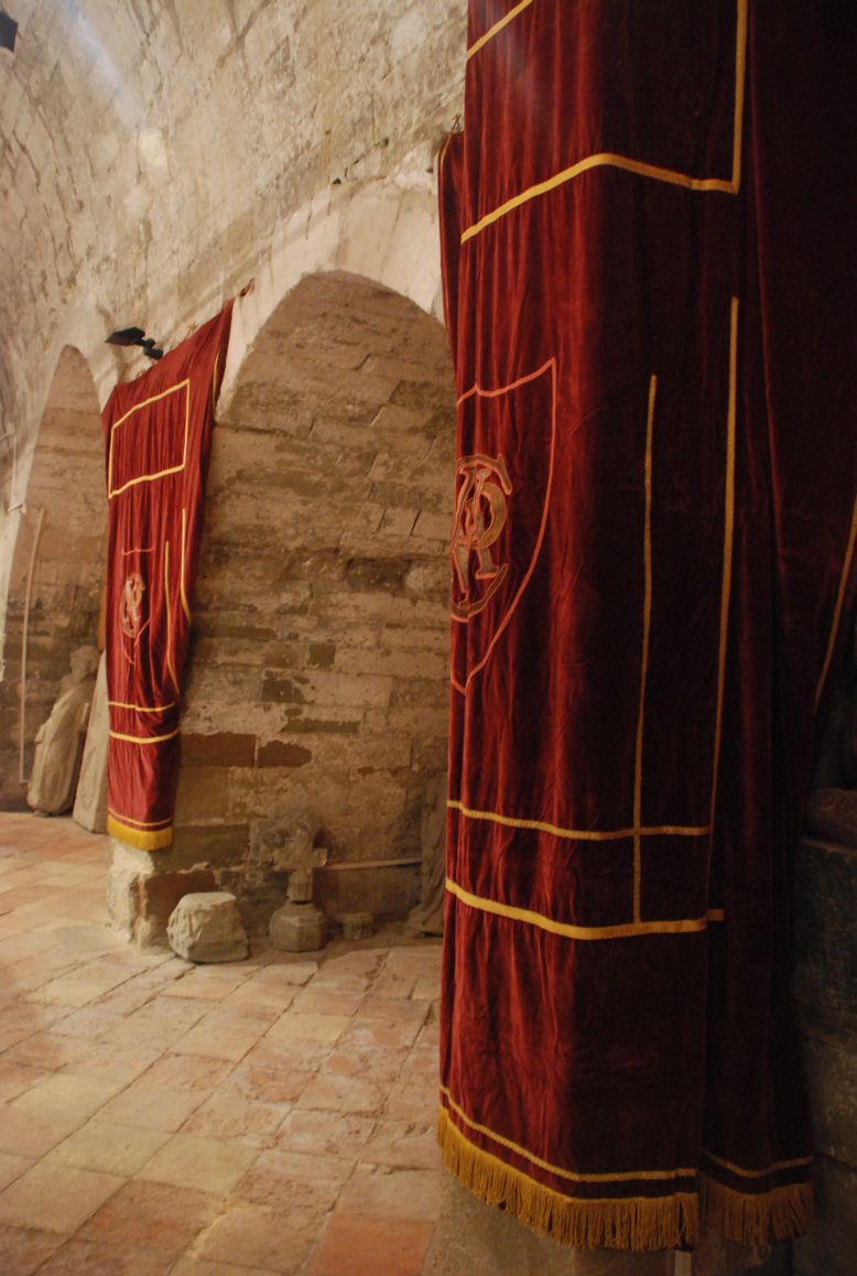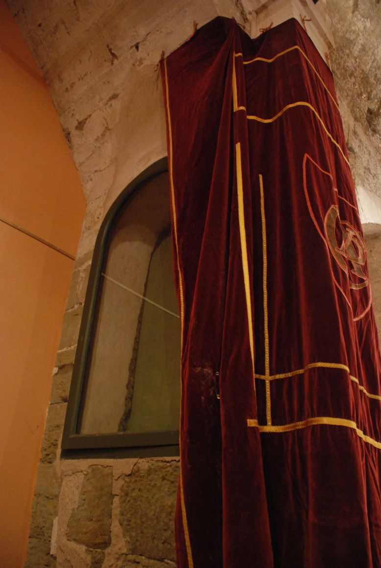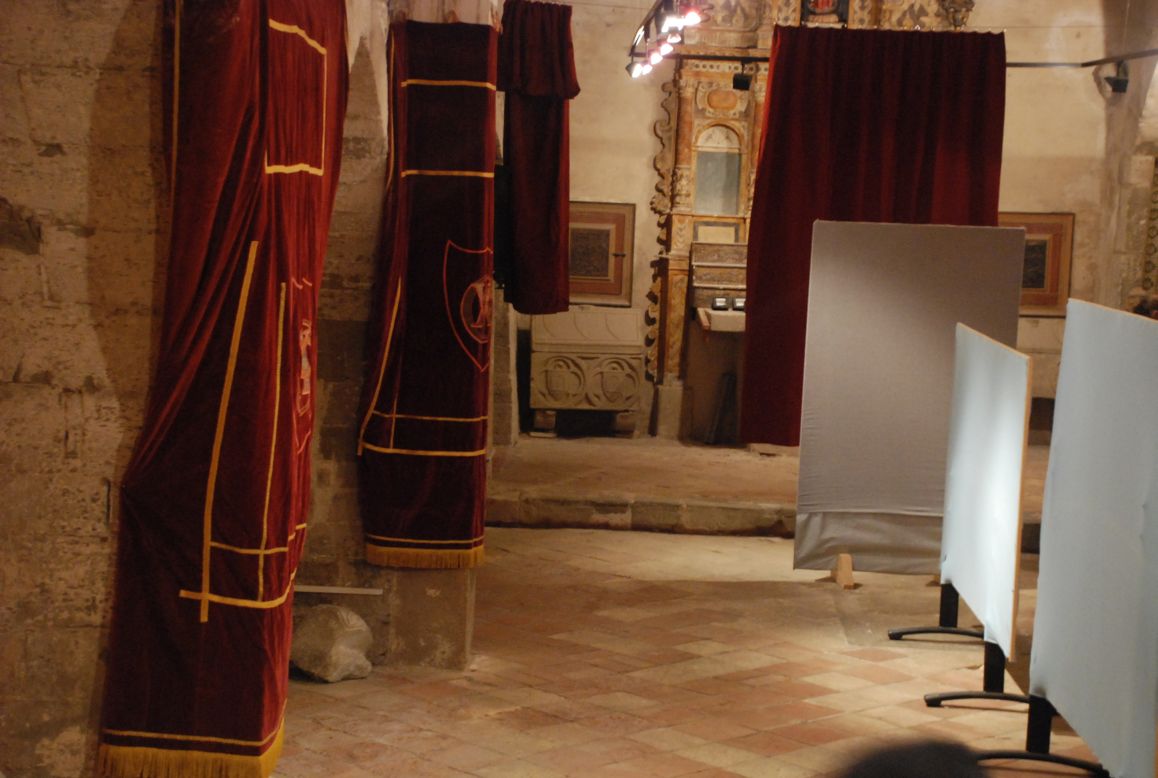 Si Santa Maria, en motiu d’aquesta Festa Major, es muda amb els magnífics domassos que tant l’embelleixen els que hem preparat aquesta exposició també hem volgut mudar el petit i acollidor espai de Sant Joan i hem cobert les seves “columnes” amb “domassos”.