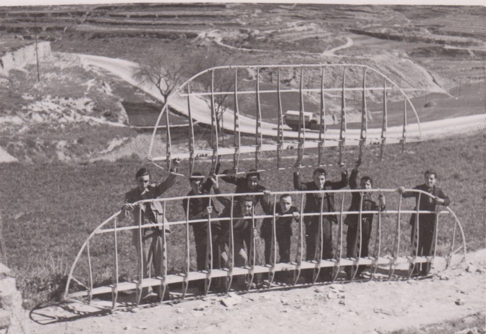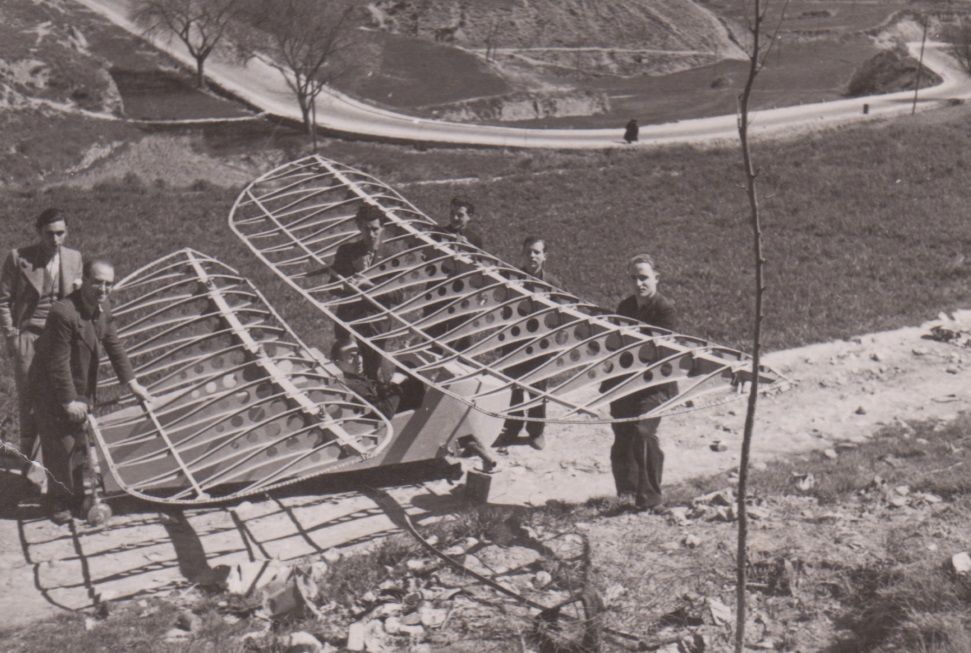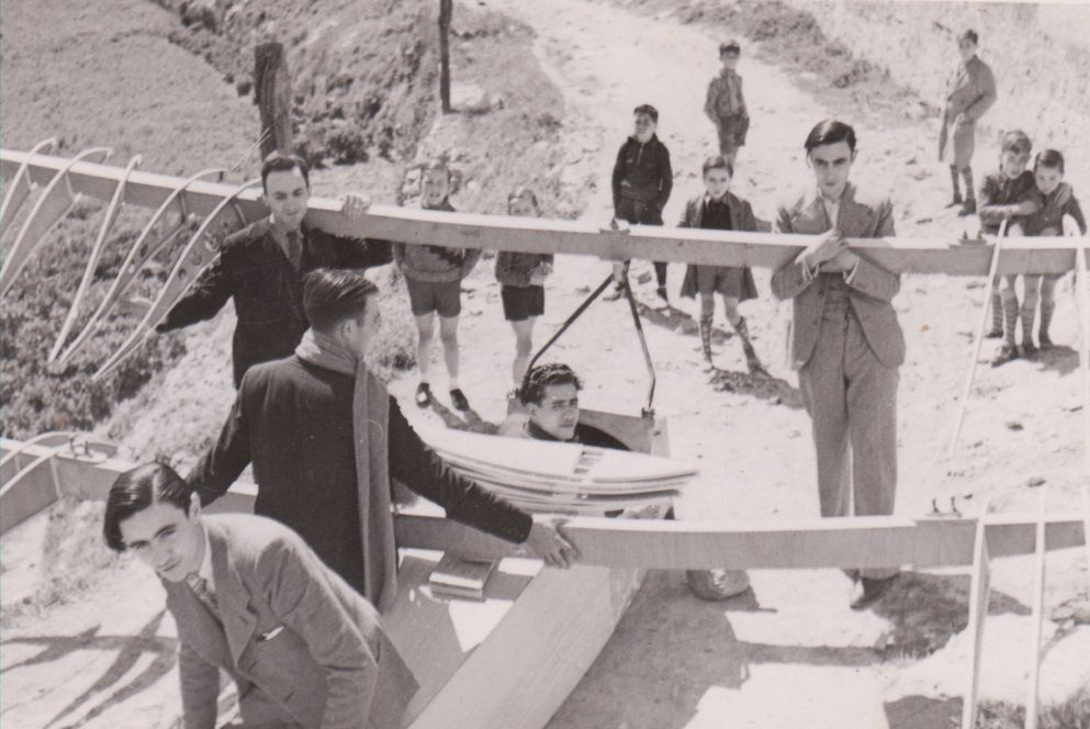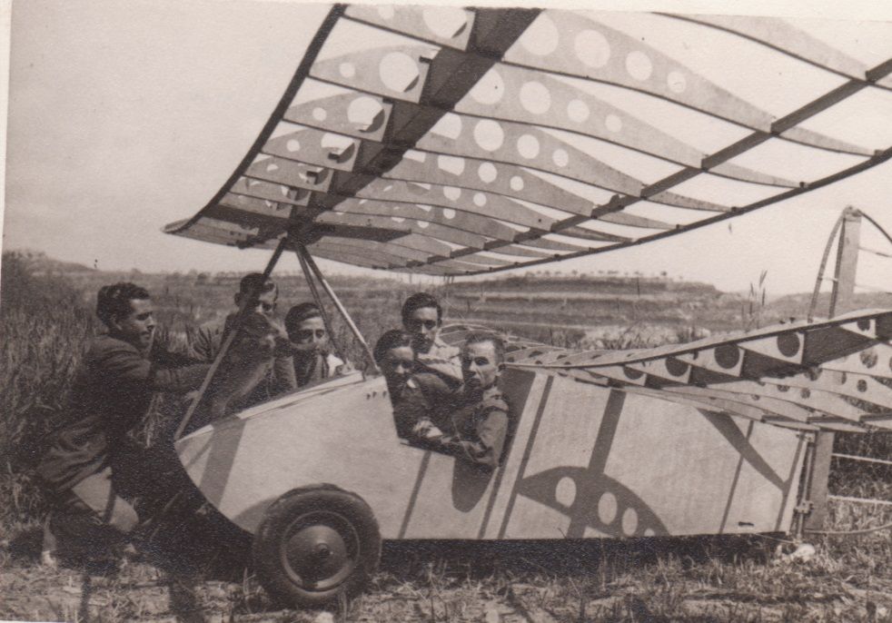 Avui publico unes fotografies de la col·lecció particular de la família Botines en les que se’ls veu treballant en la construcció del Poll del Cel i posant, junt amb els seus companys d’aventura, al costat d’aquest avió que ja anava prenent forma.