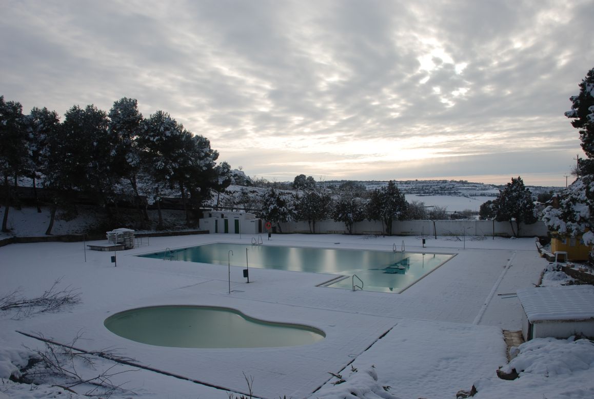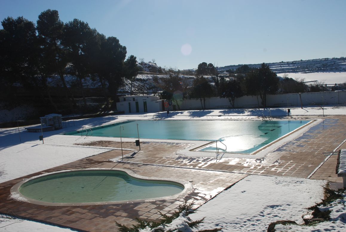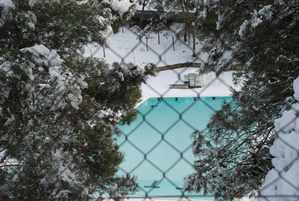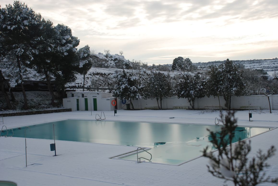 Les tumbones, en el seu llarg descans hivernal, ben apilonades vigilen la piscina.