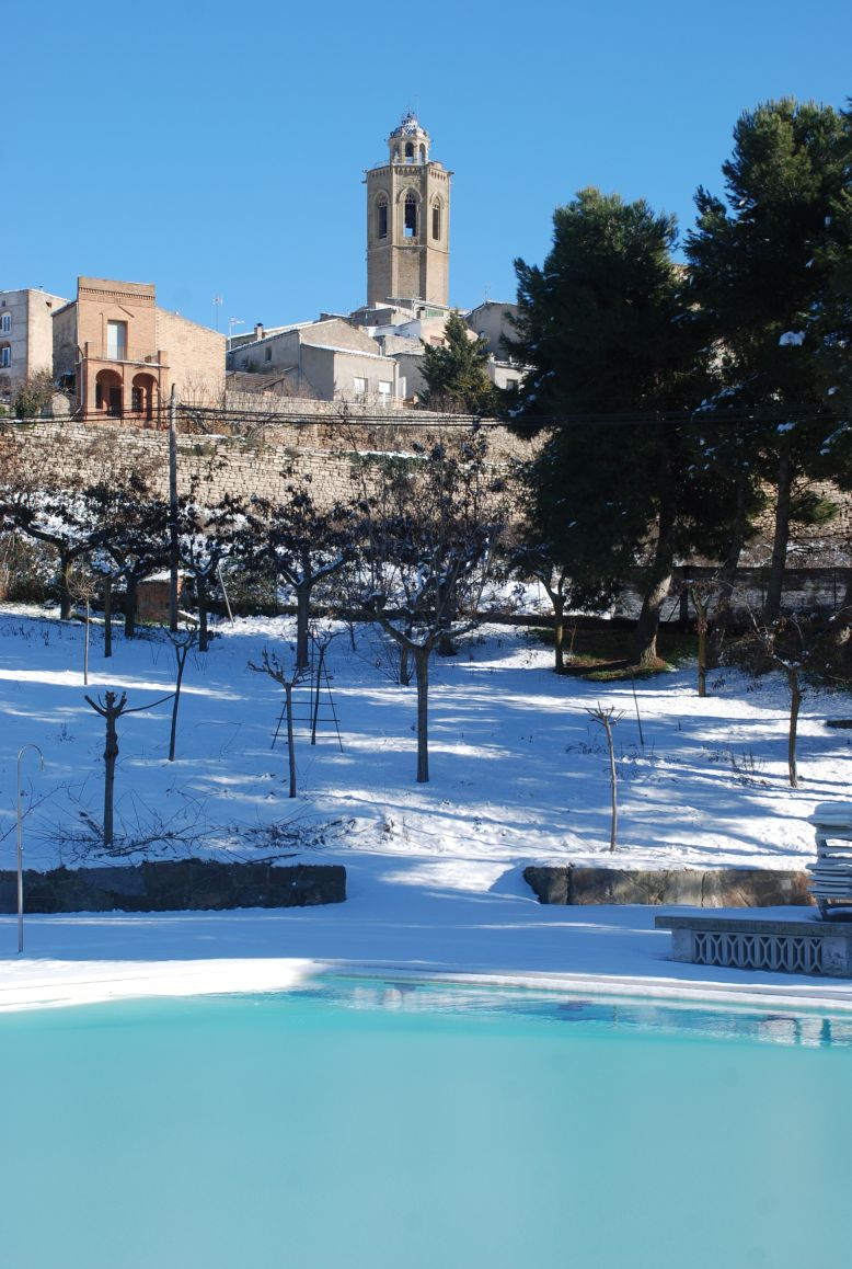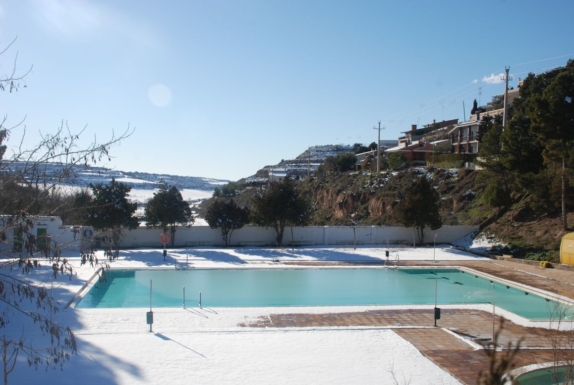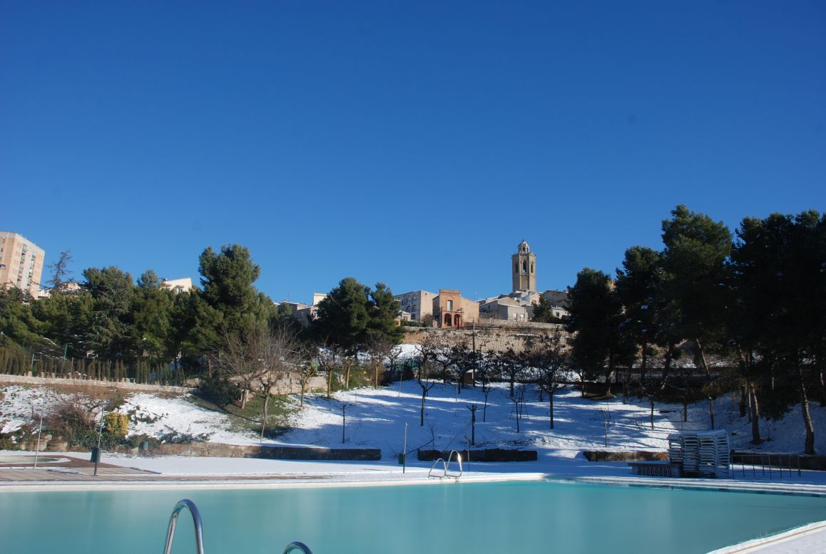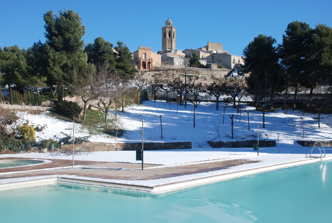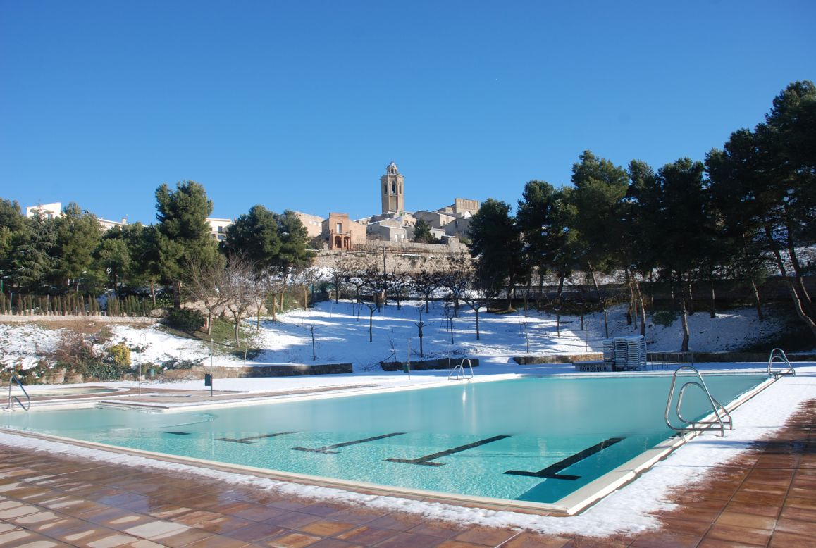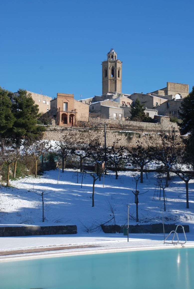 Poques piscines poden presumir d’estar tan ben situades. El campanar, en una posició més alta, les cases que l’envolten i la pujada plena d’arbres, ara despullats, fa que vèiem aquestes fotografies com el reflexe d’unes imatges plenes d’armonia i de bellesa.