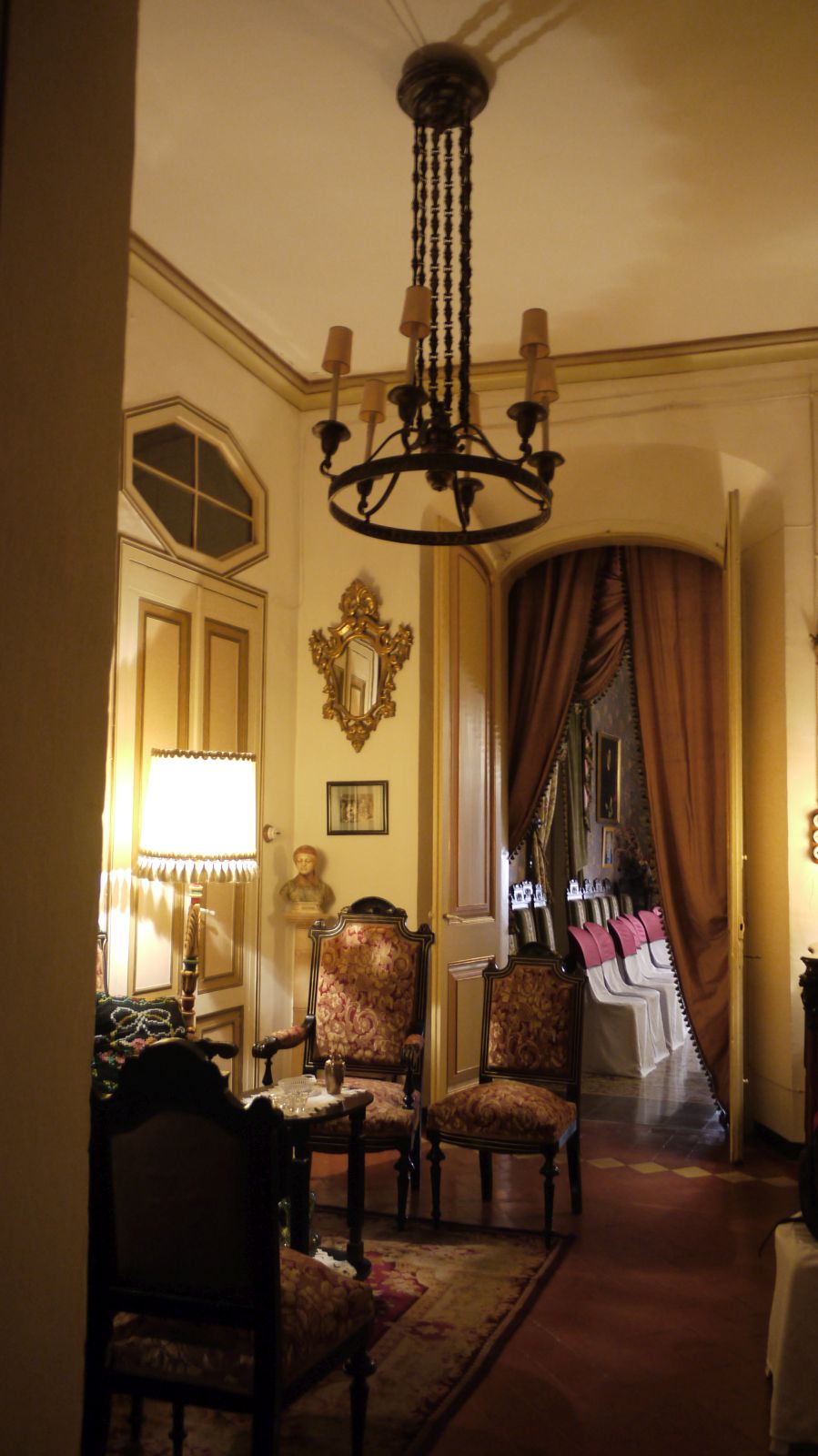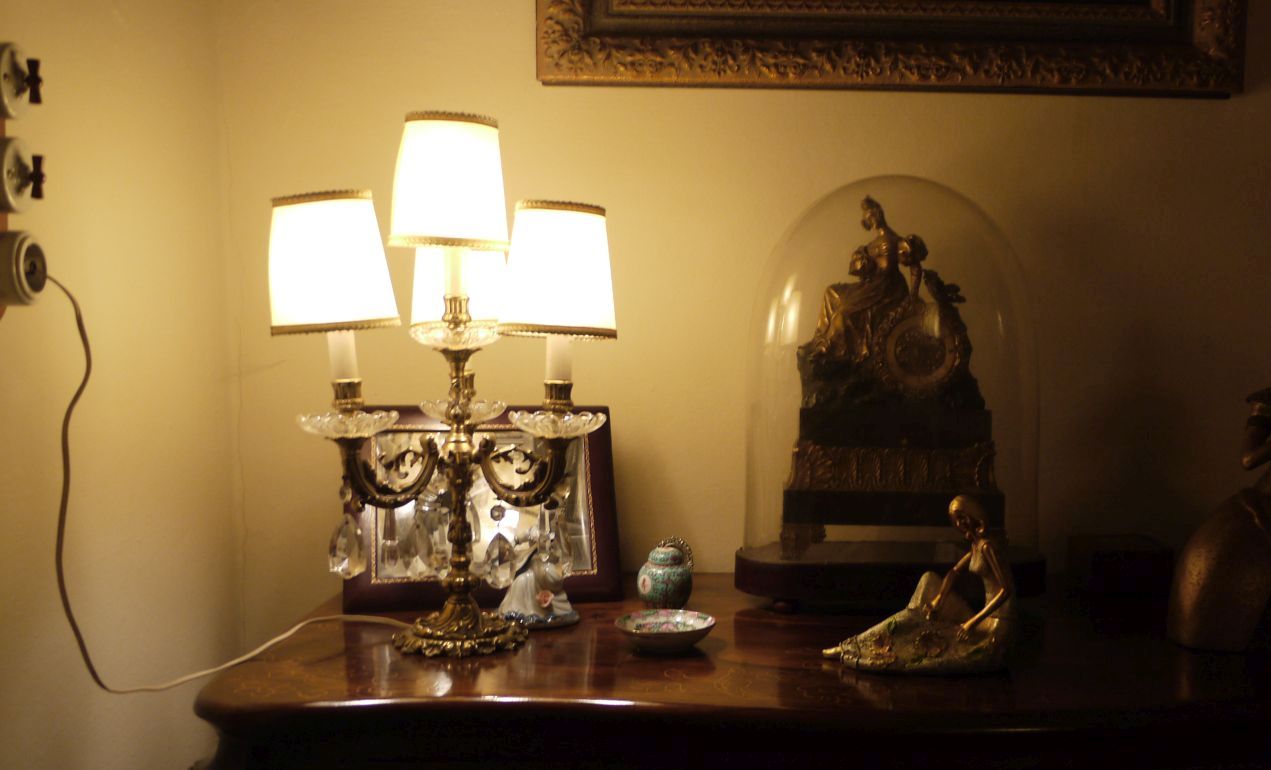 La llum suau entra per les dues balconades mentre la làmpada, resalta amb tota la seva bellesa, emmig de la sala.