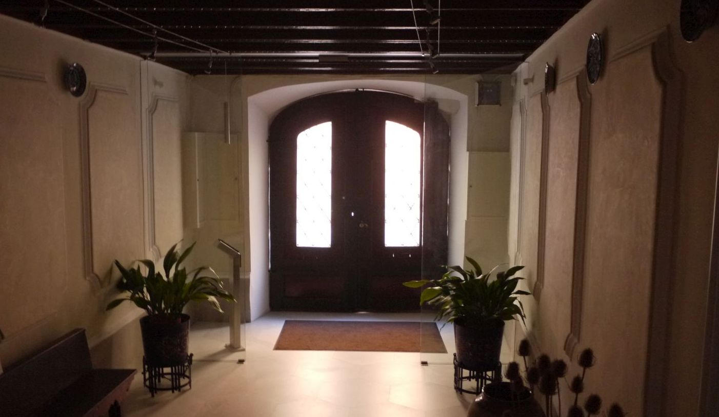 Doncs sí, és cal Razquin. Aquesta és l’entrada a la que s’accedeix des del carrer Major. Una entrada espectacular que combina la tecnologia amb la història. Unes portes de vidre correderes s’obren comandades des dels habitatges i des del despatx d’advocats. Tot plegat dóna un fantàstic aire al conjunt, que en aquesta imatge no es copsa.