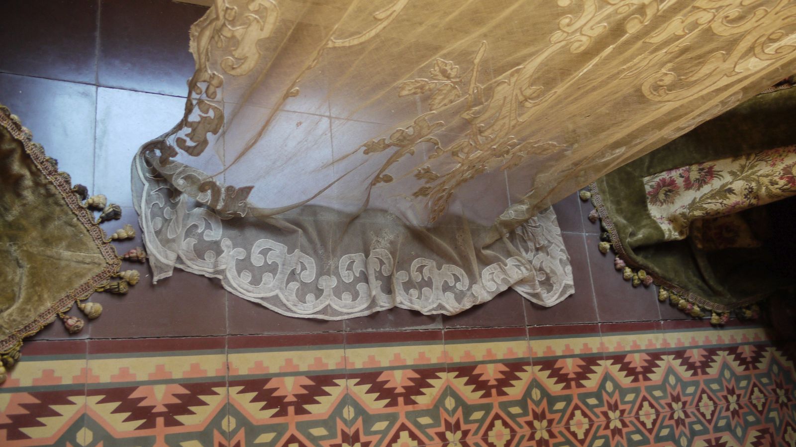Les cortines cauen al terra, tot i reposant al costat de les rajoles hidraúliques que llueixen uns dibuixos molt encertats.