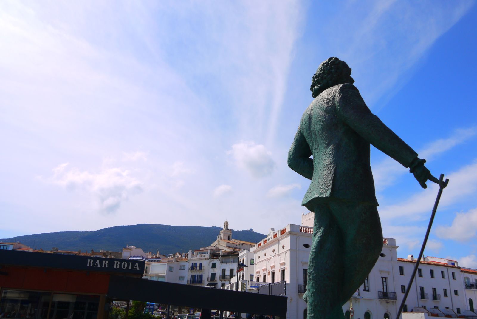 Cadaqués ret homenatge a Dalí com es pot veure en diferents racons de la ciutat. Aquí, una escultura del pintor, mira cap el poble donant l’esquena a la mar.