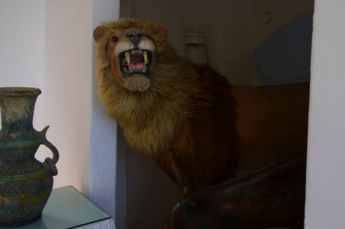 I un ferotge lleó que surt, ben enfadat, de dins el seu cau.