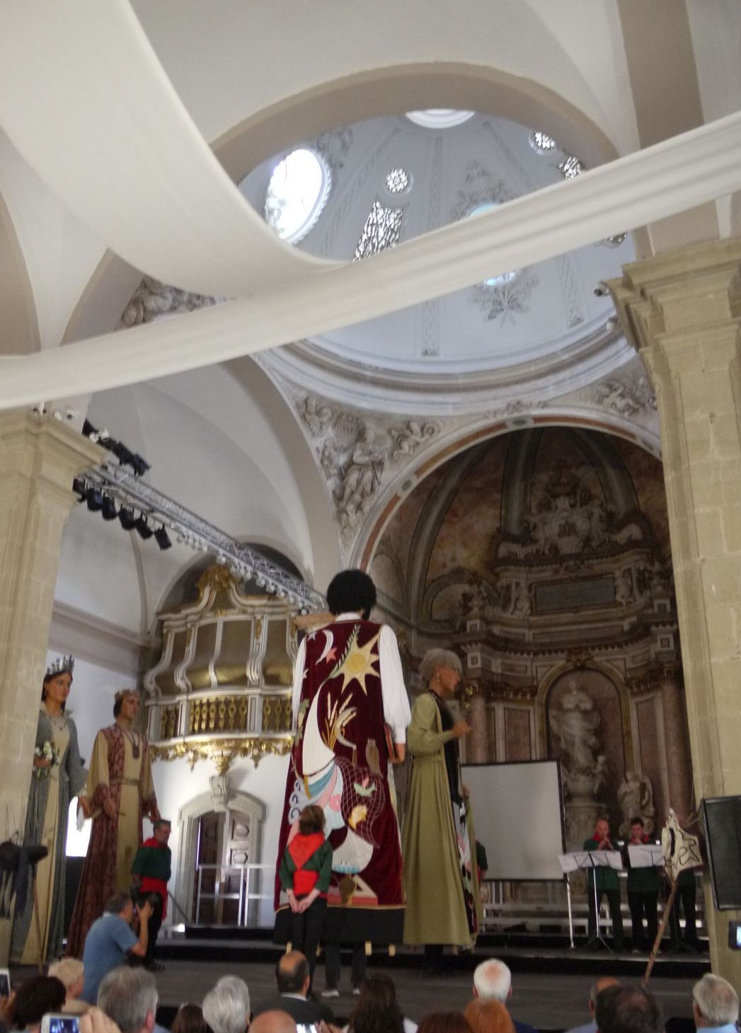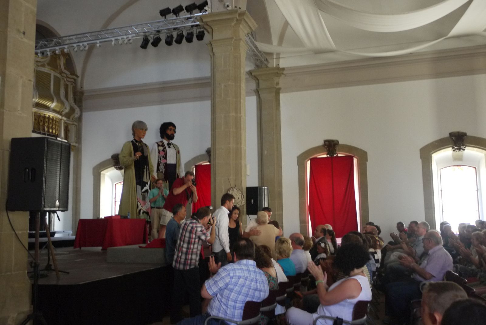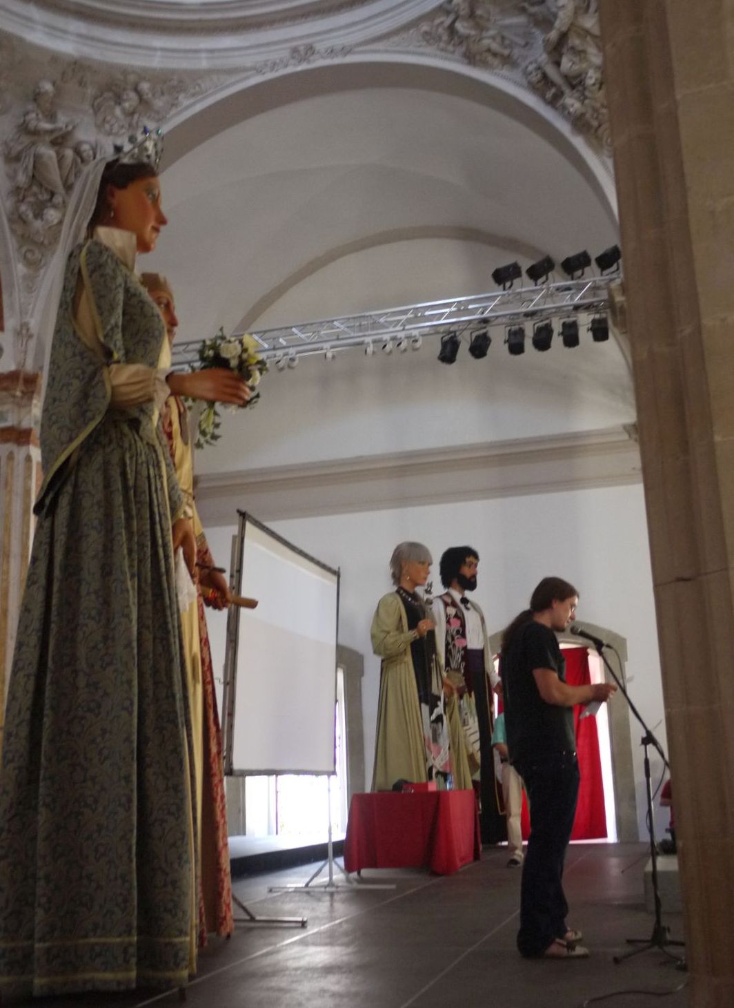 Com a cloenda de les activitats que van tenir lloc al Paranif els dos gegants convidats, dels que Cervera n’ha tingut cura durant un any, van executar el seu ball. Llàstima que els organitzadors, en acabar la projecció, no haguessin obert els llums del Paranimf. Val a dir que els parlaments i, especialment, aquest ball tan ben executat, van quedar una mica deslluïts per falta de la il·luminació adient. Es va trobar a faltar veure millor aquest retaule meravellós que hauria fet l’acte més reexit.