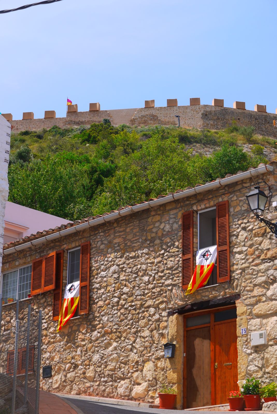 El castell domina el poble i, com a curiositat, cal explicar que les muralles estan restaurades però que, en exhaurir-se el pressupost, quan a la vila hi ha una festa tenen preparades unes capses de cartró que estan al lloc dels merlets i així donen l’acabat que originalment tenia aquesta muralla. De lluny, és impossible veure-ho si no t’ho expliquen. Després ho veureu de més a prop. A la nit hi fan focs artificials i, com que el conjunt està molt ben il·luminat el perfil sembla del tot autèntic.