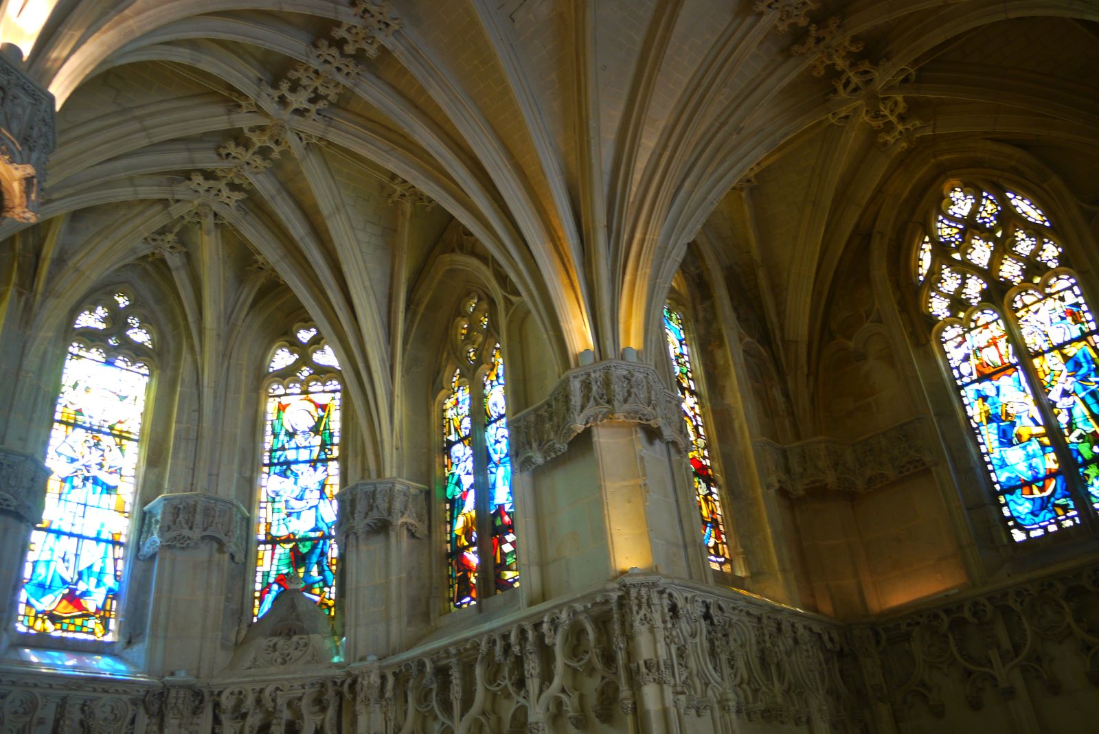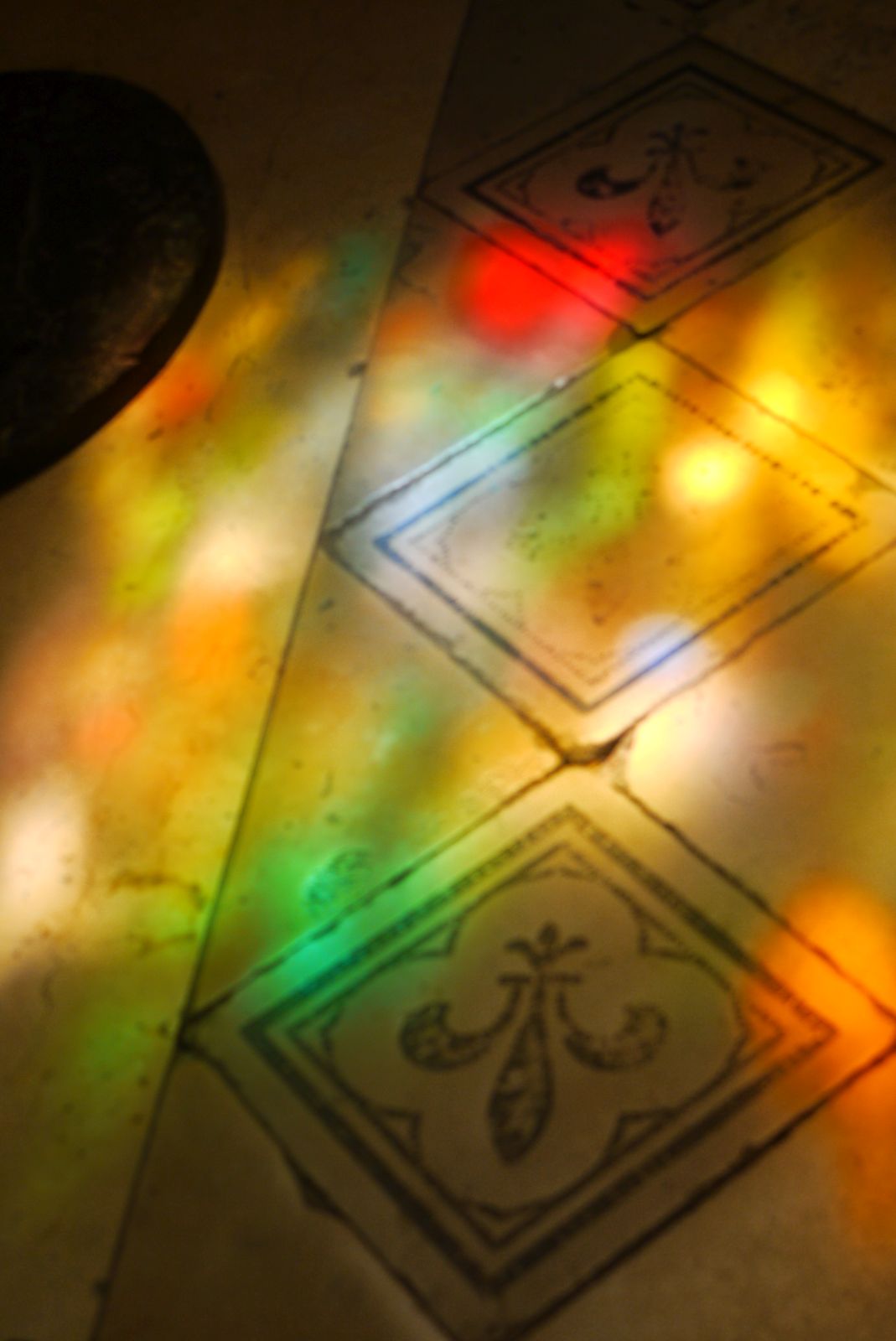 La llum escampa els colors dels vitralls pel terra.