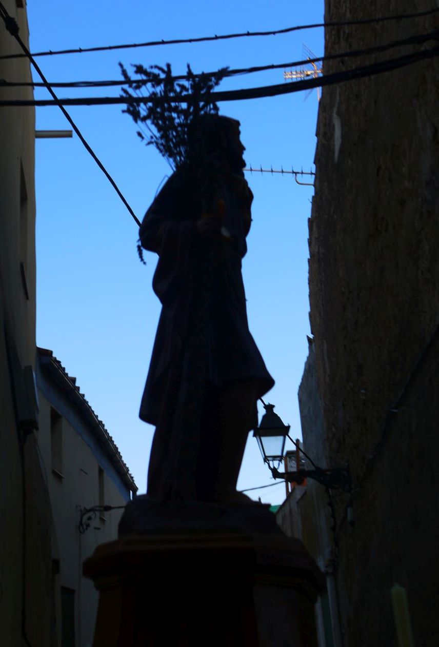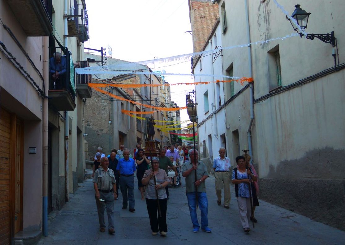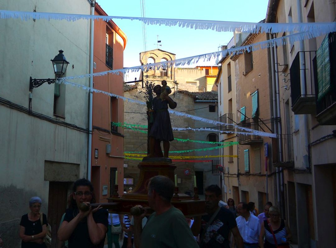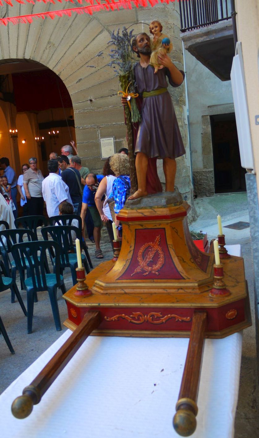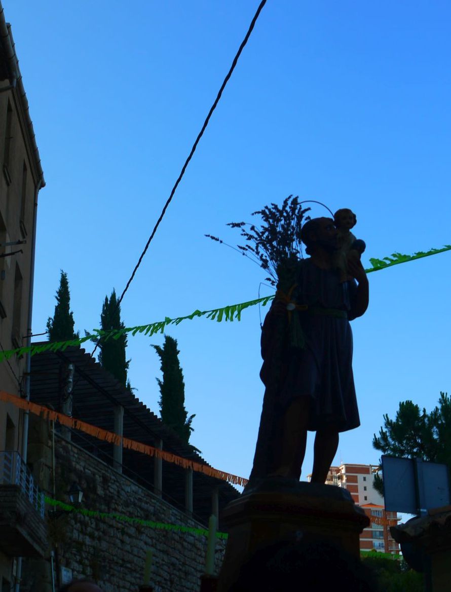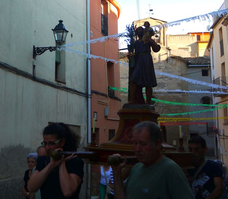 Deixem els records i les vivències perquè no acabaria i passo a presentar-vos un d’aquells actes que tenen un encant especial que també ens recorda temps perduts temps perdut: la processó de Sant Cristòfol pel barri. La imatge del Sant col·locada damunt un suport molt bonic és portada per quatre persones. (per cert una d’elles anava descalça).