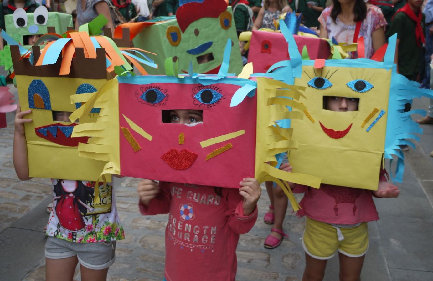 Ahir vam deixar el post amb la gent a la plaça Major on va tenir lloc l’inici de la cercavila. Gegants i capgrossos van seguir pel carrer Major fins arribar a la plaça Sant Miquel. Fixeu-vos que, això tampoc s’havia vist mai, no veureu cap dels capgrossos de Cervera. Es van quedar a casa i van donar pas a aquesta colla d’nfants tan eixerits que portaven el que havien fet al taller del matí.