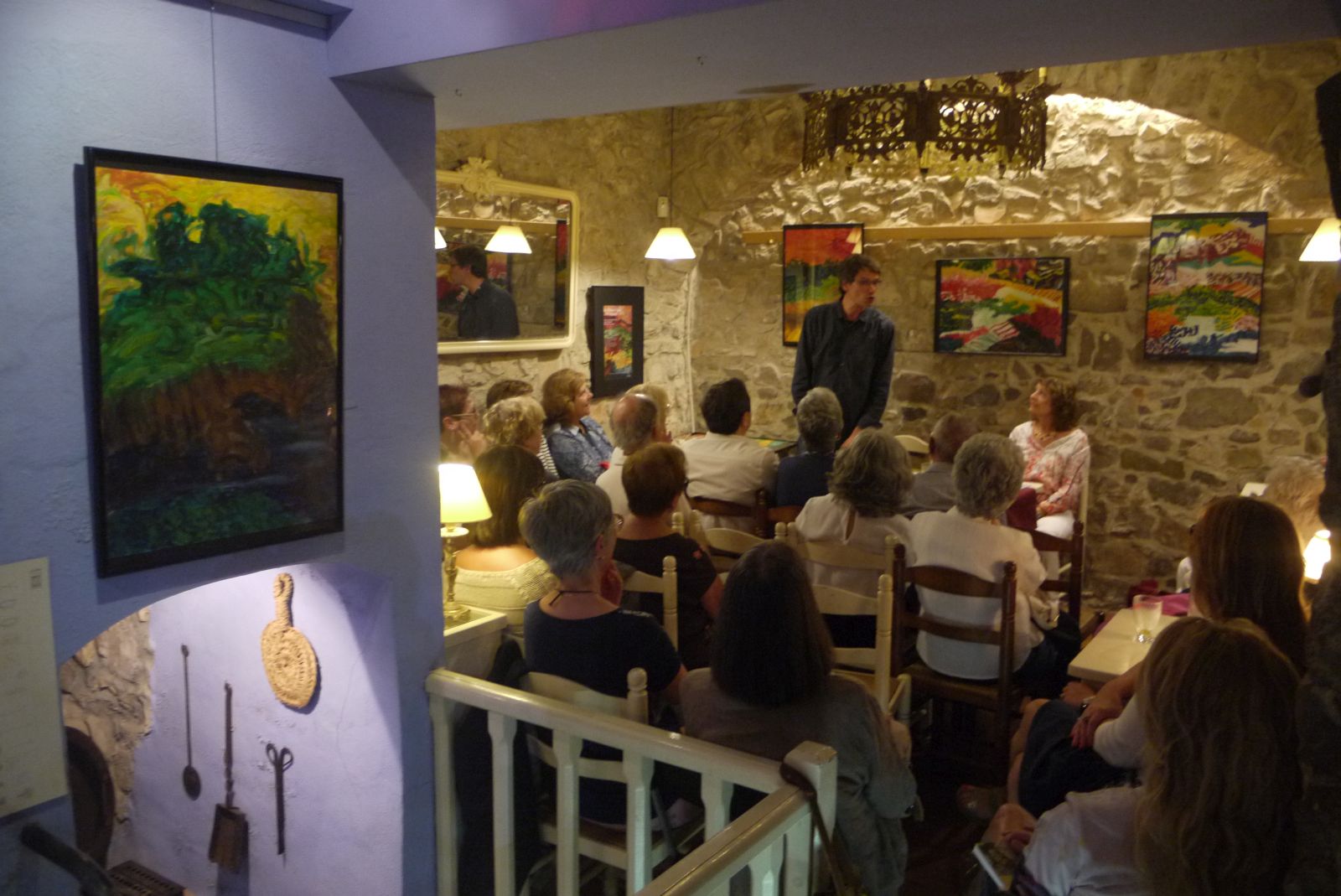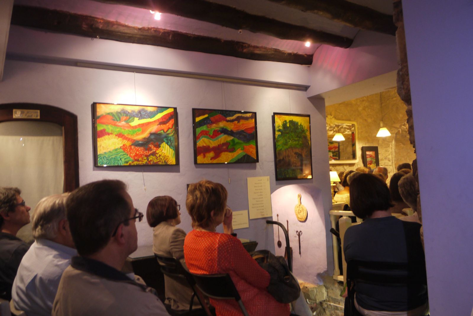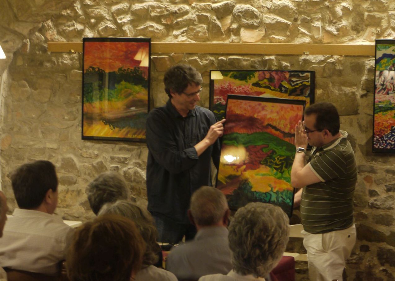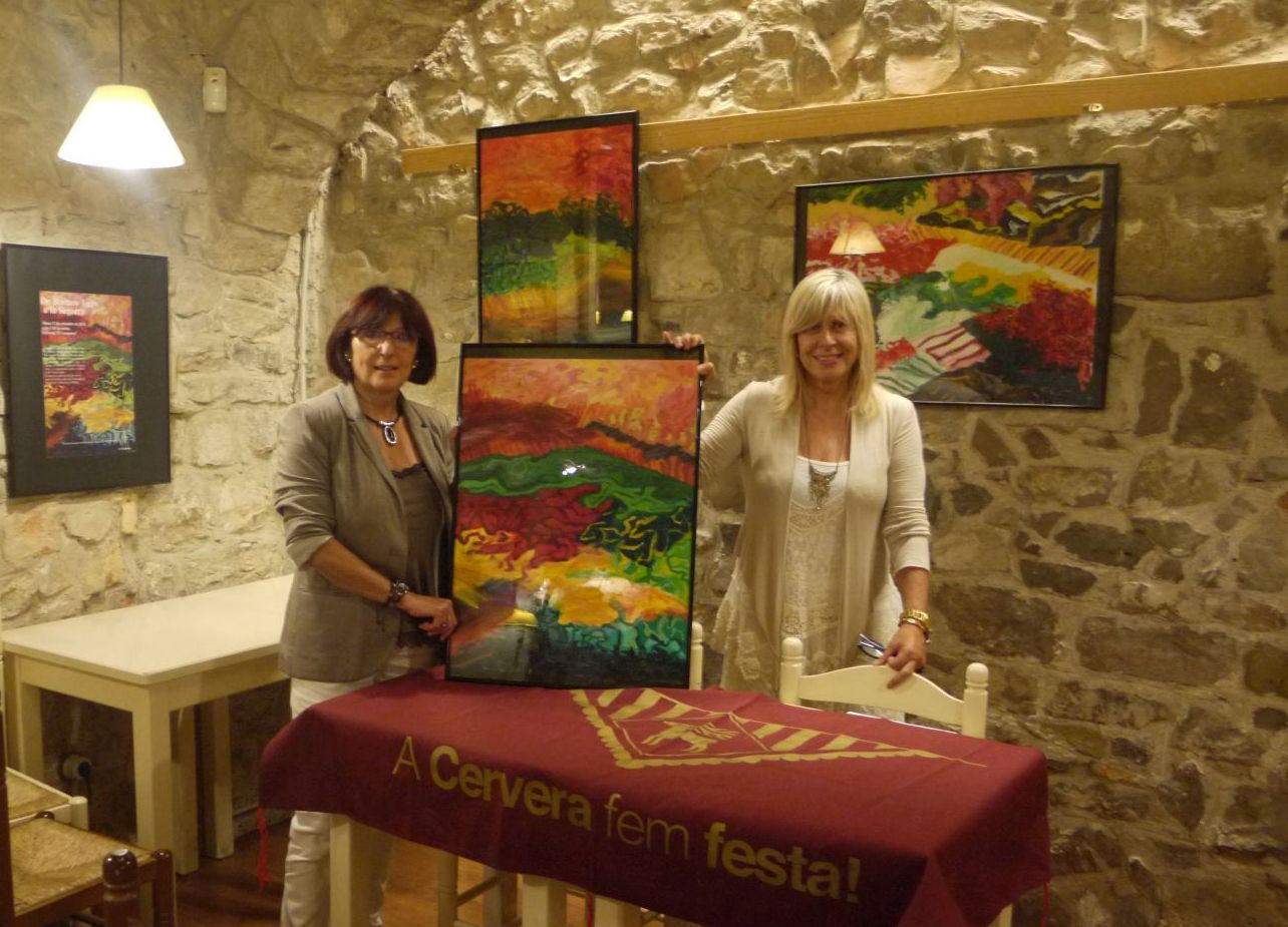 Mª Teresa Salat, Historiadora d’Art i gran comunicadora, va fer una fantàstica explicació de tot el que girava al voltant d’aquests treballs tan plens de color i la vinculació que tenen amb el cromatisme i les formes de la Segarra. Albert Turull l’acompanya, com a representant de la família cerverina de Solana, ja que el pare d’aquesta jove, Pepe Turull, era el germà gran de Ramon Turull, per tant un oncle de l’Albert.