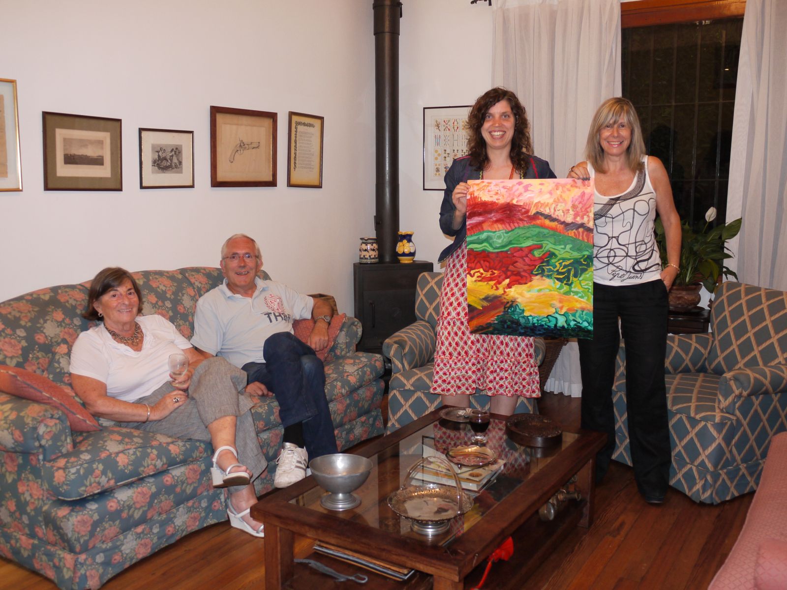 Per acabar d’arrodonir l’acte, cal tirar enrere dos anys i situar-nos a la sala d’estar de la llar de Buenos Aires del cerverí i gran amic Jaume Ximenes, que és el que fotografia el grup. Sota la mirada de Hilda, la seva esposa i de Jaume Carcasona, Solana em fa entrega d’una pintura d’aquesta sèrie dedicada a la Segarra per tal de que jo la porti a la seva família que tindrà cura d’entregar-la a la ciutat de Cervera ja que la seva voluntat és regalar-la a tots els cerverins i cerverines.
