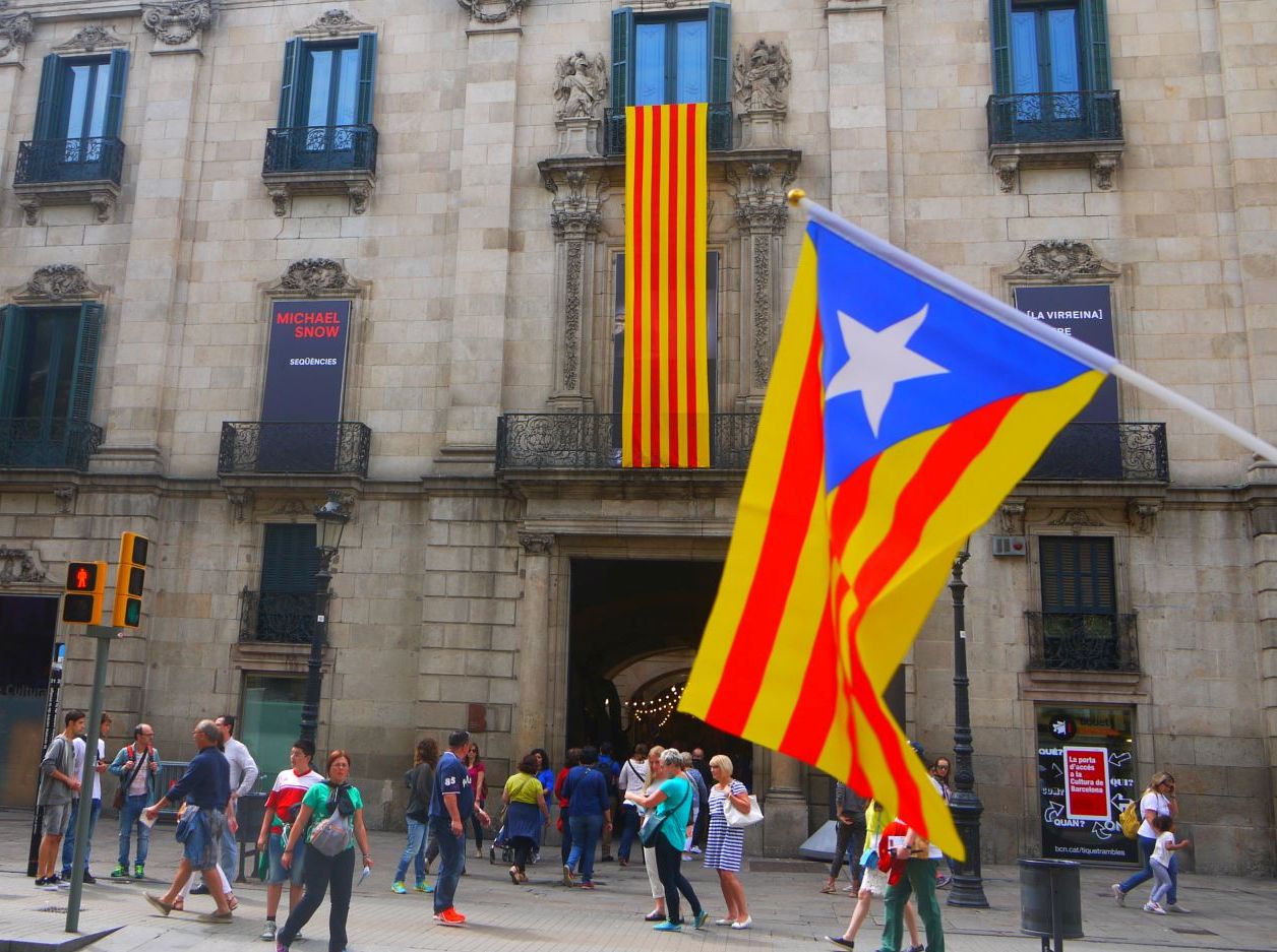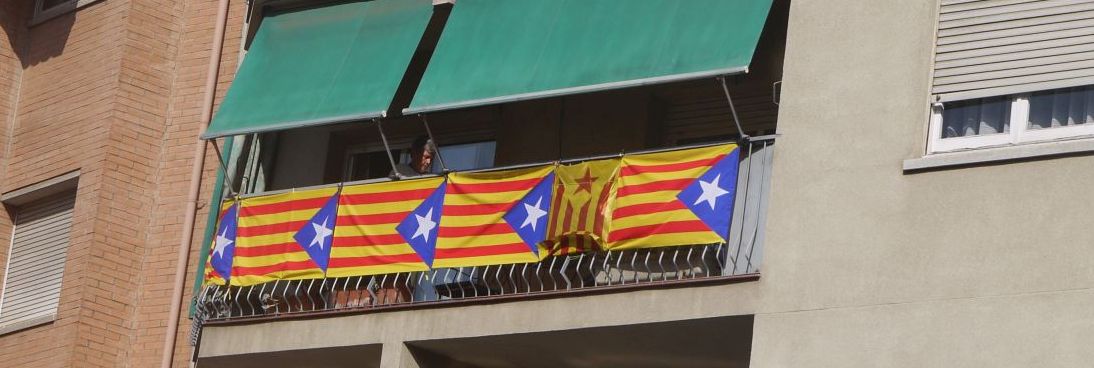 El campanar de Santa Maria del Pi espia entre aquestes dues edificacions cofat amb una estelada.