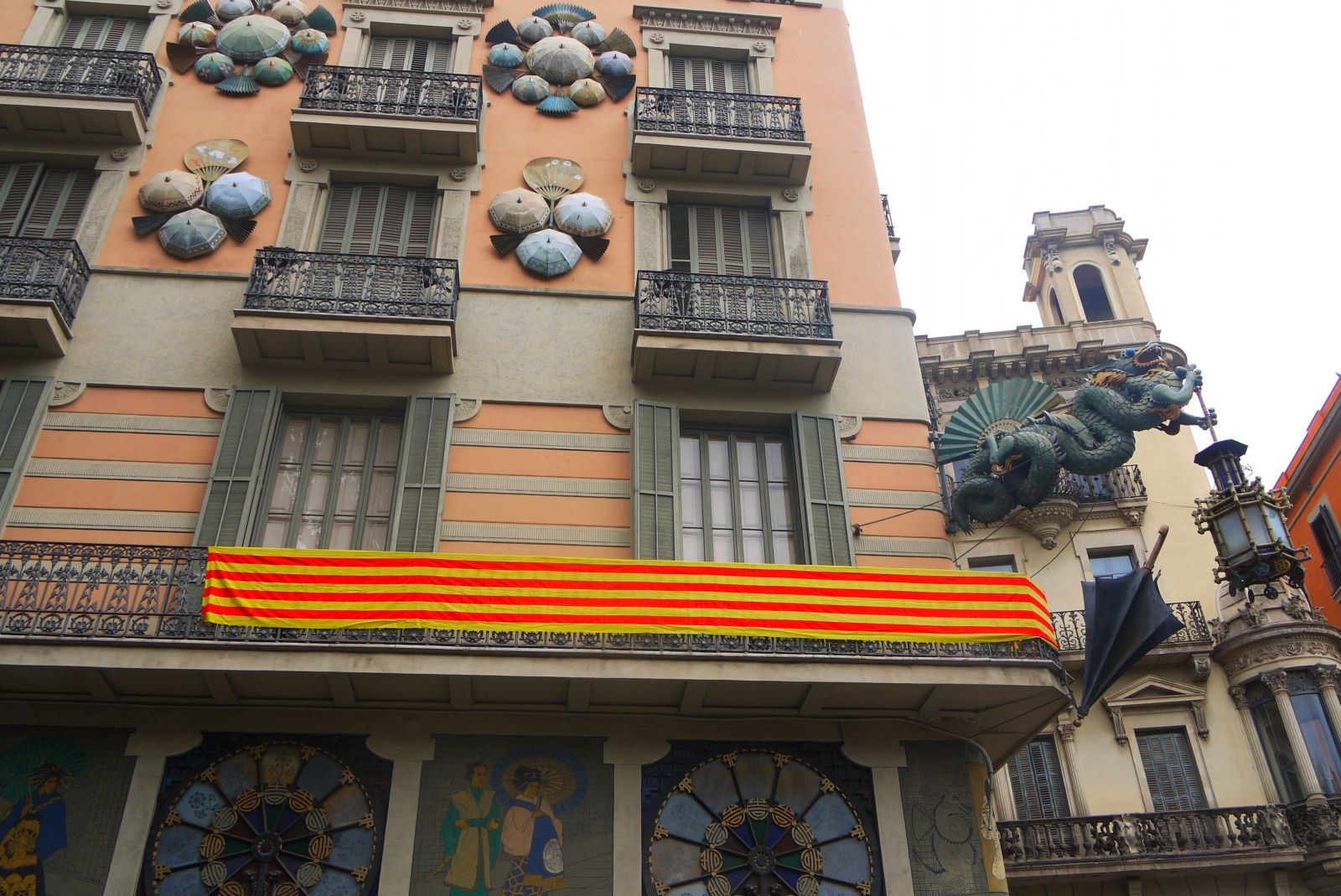 La Casa dels paraigües, un edifici amb una ornamentació bellíssima, també animava el seu balcó amb els colors grocs i vermells de la senyera.