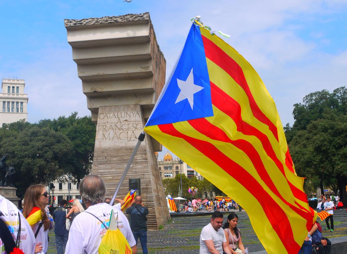 En arribar a la plaça Catalunya les estelades ja es veuen arreu. fins i tot la portava l’escultura, que aprofitava per tapar-la…