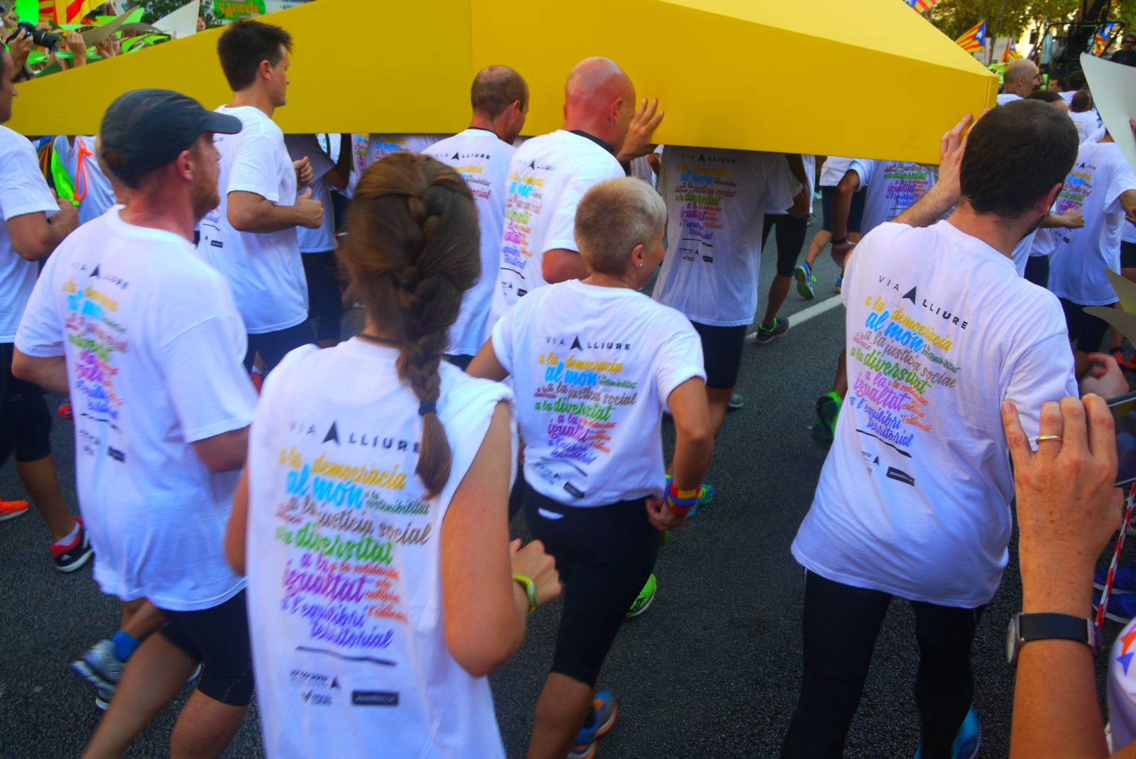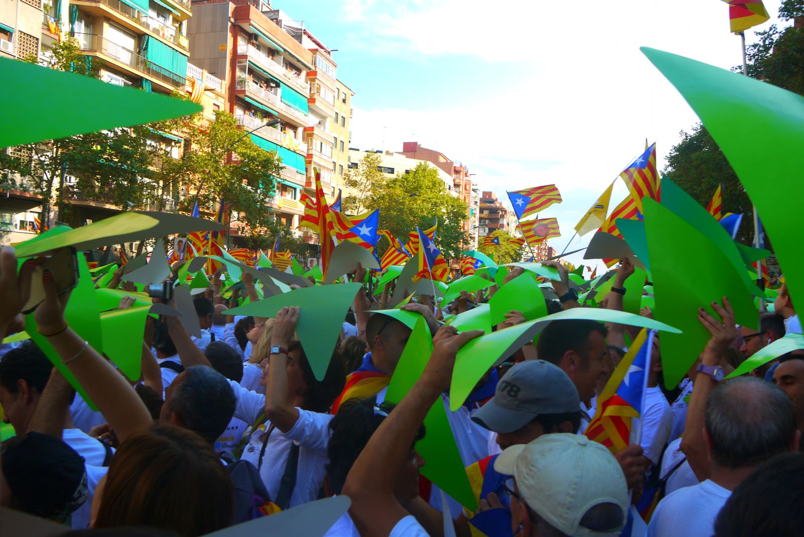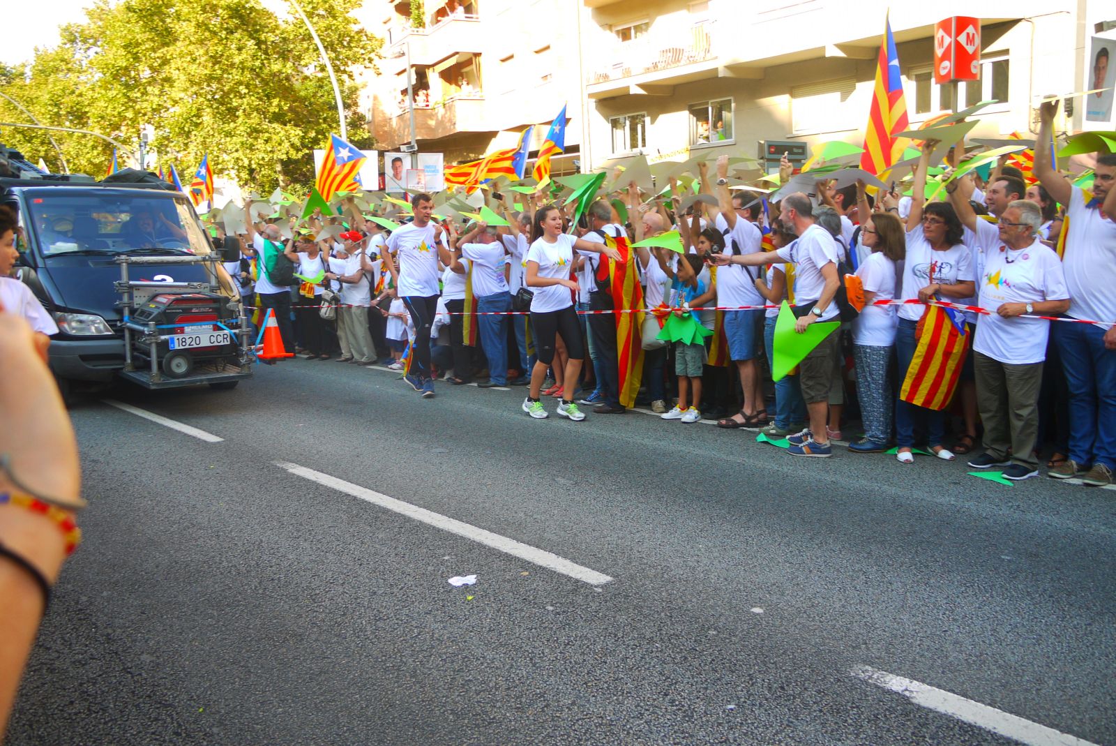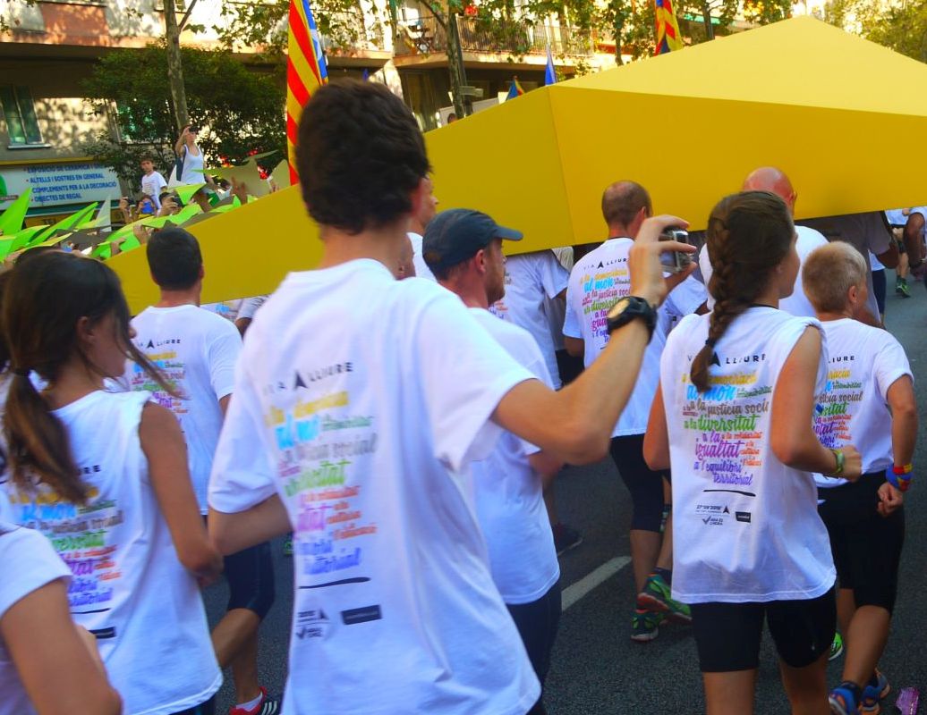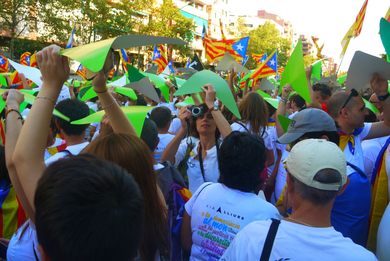 La Via Lliure va ocupar més de cinc quilòmetres de l’avinguda Meridiana. Els assistents vam formar un enorme mosaic blanc amb les samarretes blanques. La Via tenia un carril central obert que és per on va avançar el punter gegant. A mesura que passava aquest punter tothom aixecava el seu punter amb el color que li tocava segons el tram que ocupava. El mosaic, que fins aleshores es veia blanc, s’anava omplint amb els colors dels eixos de la República Catalana.